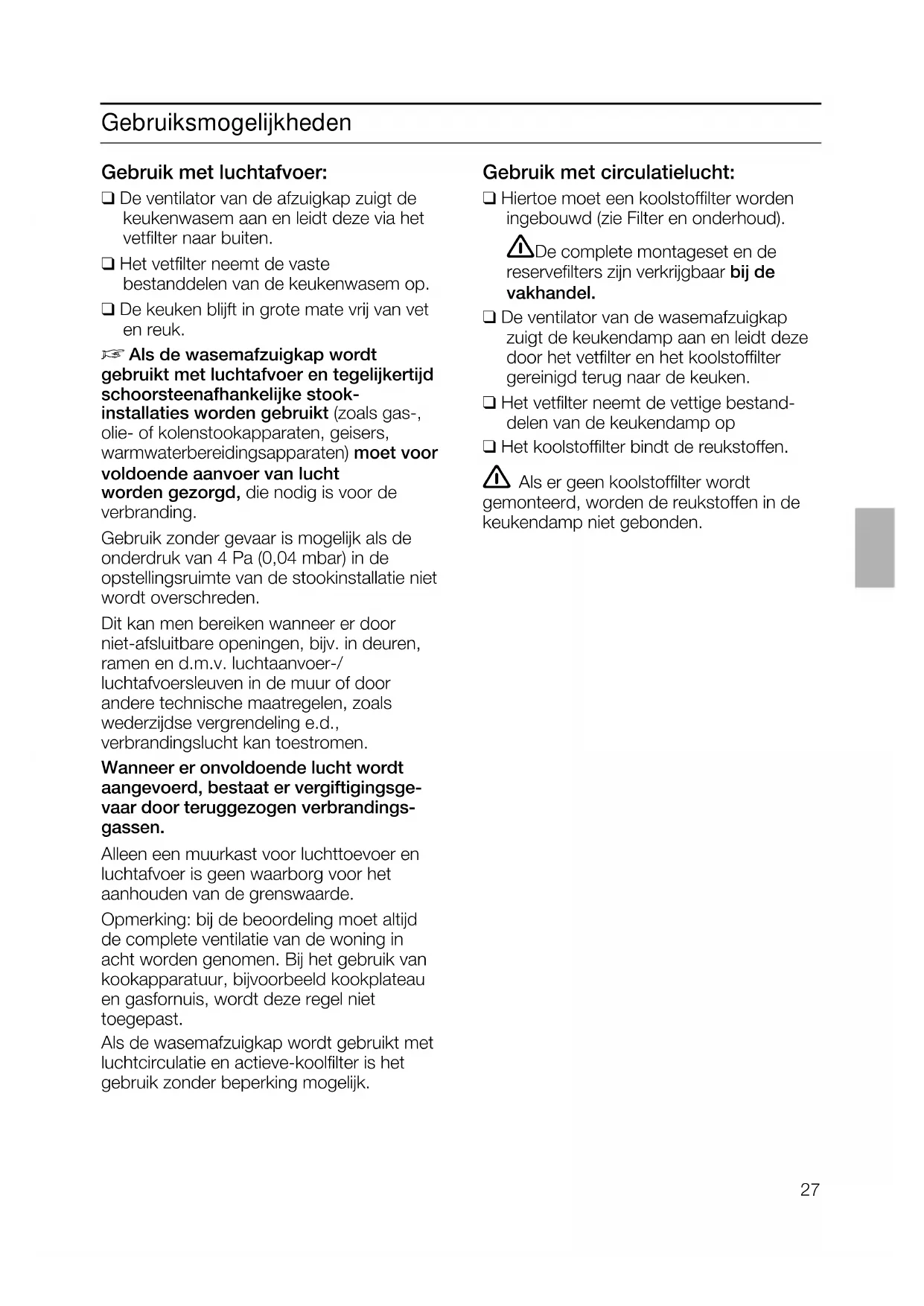 Als de wasemafzuigkap wordt gebruikt met luchtafvoer en tegelijkertijd schoorsteenafhankelijke stook- installaties worden gebruikt (zoals gas-, olie- of kolenstookapparaten, geisers, warmwaterbereidingsapparaten) moet voor voldoende aanvoer van lucht worden gezorgd, die nodig is voor de verbranding. Gebruik zonder gevaar is mogelijk als de onderdruk van 4 Pa (0,04 mbar) in de opstellingsruimte van de stookinstallatie niet wordt overschreden. Dit kan men bereiken wanneer er door niet-afsluitbare openingen, bijv. in deuren, ramen en d.m.v. luchtaanvoer-/ luchtafvoersleuven in de muur of door andere technische maatregelen, zoals wederzijdse vergrendeling e.d., verbrandingslucht kan toestromen. Wanneer er onvoldoende lucht wordt aangevoerd, bestaat er vergiftigingsge- vaar door teruggezogen verbrandings- gassen. Alleen een muurkast voor luchttoevoer en luchtafvoer is geen waarborg voor het aanhouden van de grenswaarde. Opmerking: bij de beoordeling moet altijd de complete ventilatie van de woning in acht worden genomen. Bij het gebruik van kookapparatuur, bijvoorbeeld kookplateau en gasfornuis, wordt deze regel niet toegepast. Als de wasemafzuigkap wordt gebruikt met luchtcirculatie en actieve-koolfilter is het gebruik zonder beperking mogelijk. Gebruiksmogelijkheden Gebruik met circulatielucht: ❑ Hiertoe moet een koolstoffilter worden ingebouwd (zie Filter en onderhoud). De complete montageset en de reservefilters zijn verkrijgbaar bij de vakhandel. ❑ De ventilator van de wasemafzuigkap zuigt de keukendamp aan en leidt deze door het vetfilter en het koolstoffilter gereinigd terug naar de keuken. ❑ Het vetfilter neemt de vettige bestand- delen van de keukendamp op ❑ Het koolstoffilter bindt de reukstoffen. Als er geen koolstoffilter wordt gemonteerd, worden de reukstoffen in de keukendamp niet gebonden.28 Vóór het eerste gebruik Belangrijke aanwijzingen: ❑ Deze gebruiksaanwijzing geldt voor verschillende uitvoeringen van het apparaat. Het is mogelijk dat er een aantal kenmerken worden beschreven die niet van toepassing zijn op uw apparaat. ❑ Deze afzuigkap voldoet aan de geldende veiligheidsvoorschriften. Reparaties mogen uitsluitend worden uitgevoerd door een vakman. Door ondeskundige reparaties kunnen aanzienlijke gevaren voor de gebruiker ontstaan. Gaskookplaten / gasfornuizen Gebruik niet alle gaskookzones tegelijk langdurig (max. 15 minuten) op de hoogste stand, anders bestaat er kans op brandwonden bij aanraking van de oppervlakken van de behuizing en gevaar van beschadiging van de afzuigkap. Bij gebruik van de afzuigkap boven een gaskookplaat waarvan gelijktijdig drie of meer gaskookzones worden gebruikt, moet de afzuigkap op de maximumstand worden gezet. ❑ Lees de gebruiksaanwijzing zorgvuldig voordat u het nieuwe apparaat gebruikt. Ze bevat belangrijke informatie voor uw veiligheid en voor het gebruik en het onderhoud van het apparaat. ❑ Bewaar de gebruiksaanwijzing en het montagevoorschrift zorgvuldig, eventueel voor een volgende bezitter van het apparaat. ❑ Dit apparaat is gekenmerkt in overeenstemmig met de Europese richtlijn 2002/96/EG betreffende afgedankte elektrische en elektronische apparatuur (waste electrical and electronic equipment – WEEE). De richtlijn geeft het kader aan voor de in de EU geldige terugneming en verwerking van oude apparaten.