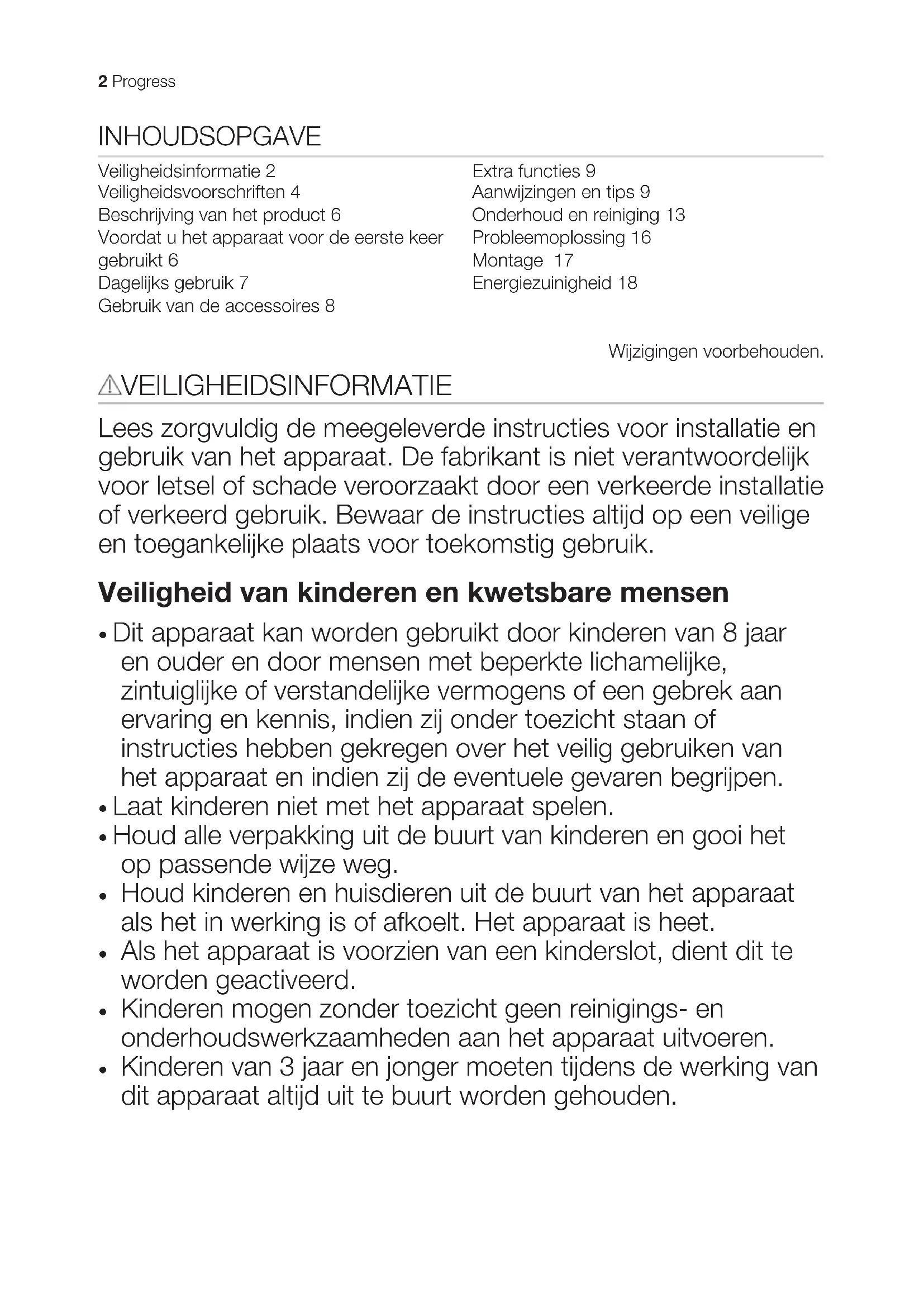 Kinderen van 3 jaar en jonger moeten tijdens de werking van dit apparaat altijd uit te buurt worden gehouden. 2 ProgressAlgemene veiligheid