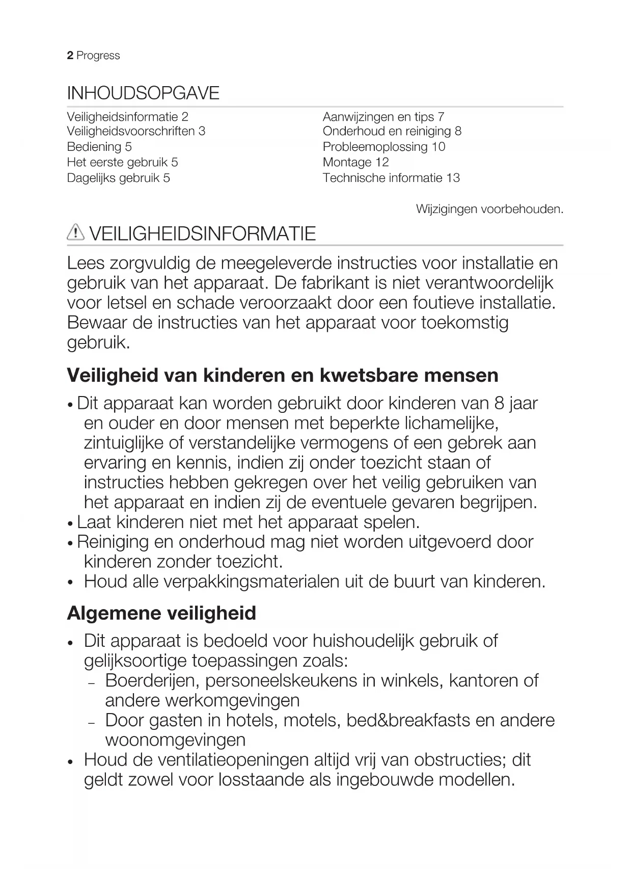 Houd de ventilatieopeningen altijd vrij van obstructies; dit geldt zowel voor losstaande als ingebouwde modellen. 2 Progress• Gebruik geen mechanische of andere middelen om het ontdooiproces te versnellen, behalve die middelen die door de fabrikant zijn aanbevolen.