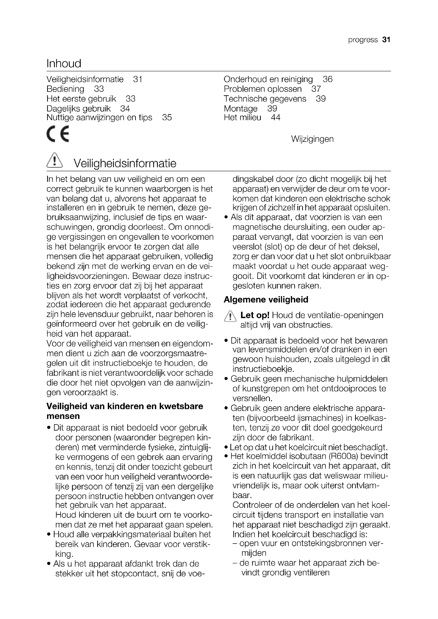 - The door opens and closes correctly. progress 29Reversibility of the freezer door 180˚ Environmental concerns The symbol on the product or on its packaging indicates that this product may not be treated as household waste. Instead it should be taken to the appropriate collection point for the recycling of electrical and electronic equipment. By ensuring this product is disposed of correctly, you will help prevent potential negative consequences for the environment and human health, which could otherwise be caused by inappropriate waste handling of this product. For more detailed information about recycling of this product, please contact your local council, your household waste disposal service or the shop where you purchased the product. 30 progressInhoud Veiligheidsinformatie 31 Bediening 33 Het eerste gebruik 33 Dagelijks gebruik 34 Nuttige aanwijzingen en tips 35 Onderhoud en reiniging 36 Problemen oplossen 37 Technische gegevens 39 Montage 39 Het milieu 44 Wijzigingen voorbehouden Veiligheidsinformatie In het belang van uw veiligheid en om een correct gebruik te kunnen waarborgen is het van belang dat u, alvorens het apparaat te installeren en in gebruik te nemen, deze ge- bruiksaanwijzing, inclusief de tips en waar- schuwingen, grondig doorleest. Om onnodi- ge vergissingen en ongevallen te voorkomen is het belangrijk ervoor te zorgen dat alle mensen die het apparaat gebruiken, volledig bekend zijn met de werking ervan en de vei- ligheidsvoorzieningen. Bewaar deze instruc- ties en zorg ervoor dat zij bij het apparaat blijven als het wordt verplaatst of verkocht, zodat iedereen die het apparaat gedurende zijn hele levensduur gebruikt, naar behoren is geïnformeerd over het gebruik en de veilig- heid van het apparaat. Voor de veiligheid van mensen en eigendom- men dient u zich aan de voorzorgsmaatre- gelen uit dit instructieboekje te houden, de fabrikant is niet verantwoordelijk voor schade die door het niet opvolgen van de aanwijzin- gen veroorzaakt is. Veiligheid van kinderen en kwetsbare mensen