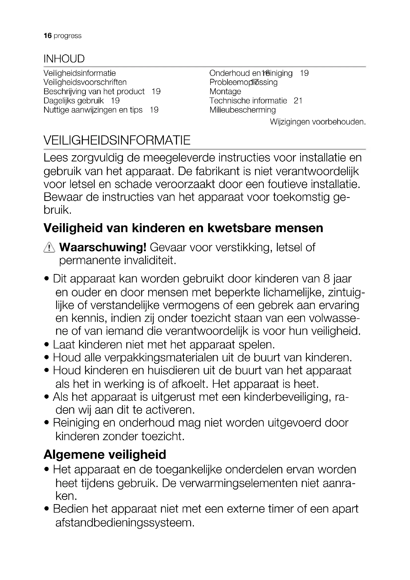 - Bedien het apparaat niet met een externe timer of een apart afstandbedieningssysteem. 16 progress• Zonder toezicht koken op een kookplaat met vet of olie kan gevaarlijk zijn en brandgevaar opleveren.