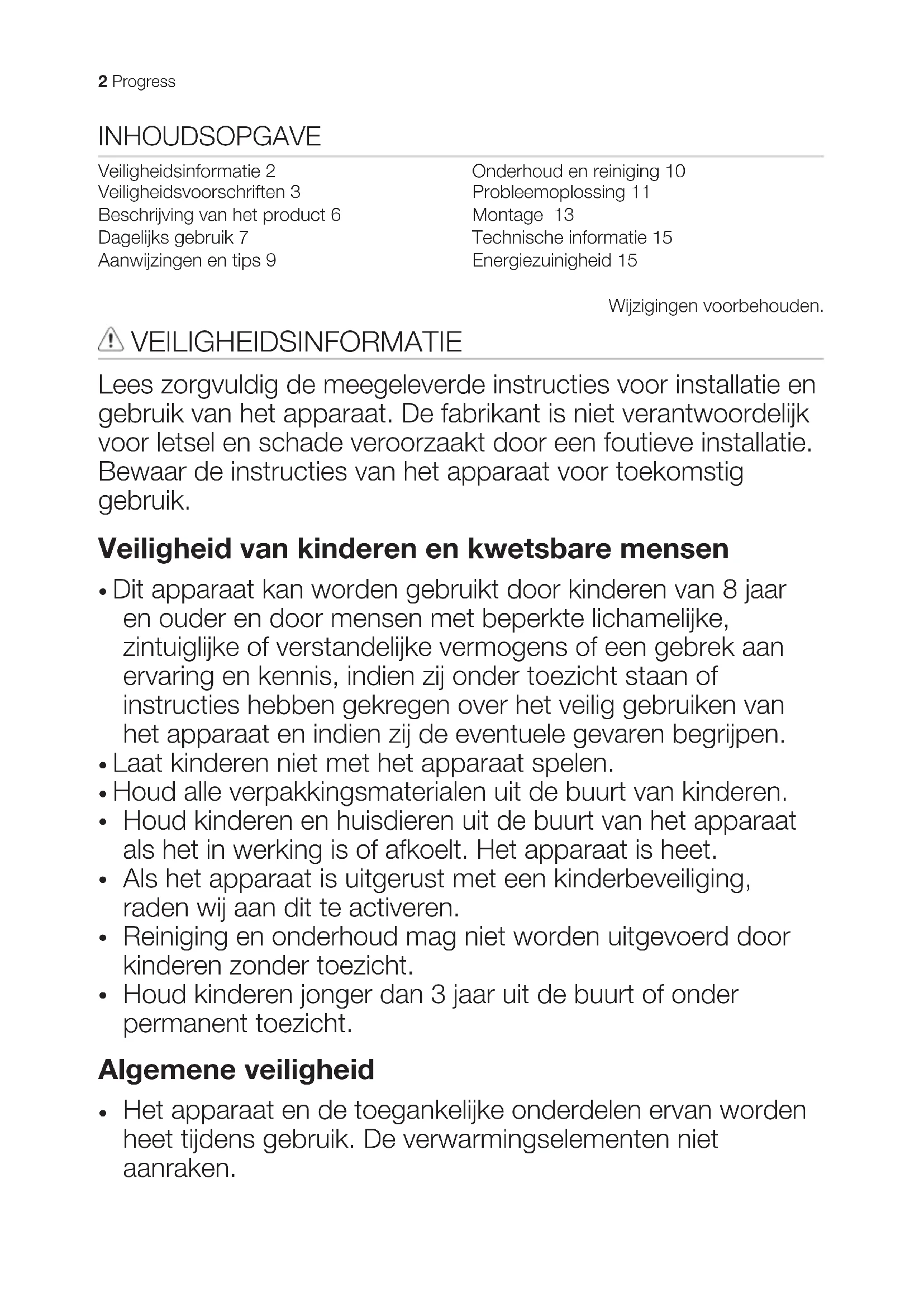 - Gebruik de restwarmte om het eten warm te houden of te smelten. MILIEUBESCHERMING Recycle de materialen met het symbool . Gooi de verpakking in een geschikte verzamelcontainer om het te recyclen. Help om het milieu en de volksgezondheid te beschermen en recycle het afval van elektrische en elektronische apparaten. Gooi apparaten gemarkeerd met het symbool niet weg met het huishoudelijk afval. Breng het product naar het milieustation bij u in de buurt of neem contact op met de gemeente. 16 ProgressCONTENTS Safety information 17 Safety instructions 18 Product description 20 Daily use 22 Hints and tips 24 Care and cleaning 25 Troubleshooting 25 Installation 27 Technical information 29 Energy efficiency 29 Subject to change without notice. SAFETY INFORMATION Before the installation and use of the appliance, carefully read the supplied instructions. The manufacturer is not responsible if an incorrect installation and use causes injuries and damages. Always keep the instructions with the appliance for future reference. Children and vulnerable people safety
