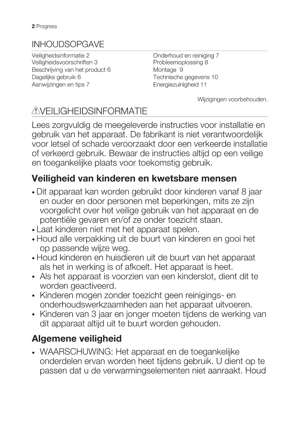 - Gebruik de restwarmte om het eten warm te houden of te smelten. MILIEUBESCHERMING Recycle de materialen met het symbool . Gooi de verpakking in een geschikte verzamelcontainer om het te recyclen. Help om het milieu en de volksgezondheid te beschermen en recycle het afval van elektrische en elektronische apparaten. Gooi apparaten gemarkeerd met het symbool niet weg met het huishoudelijk afval. Breng het product naar het milieustation bij u in de buurt of neem contact op met de gemeente. Progress 11CONTENTS Safety information 12 Safety instructions 13 Product description 15 Daily use 16 Hints and tips 16 Care and cleaning 17 Troubleshooting 17 Installation 18 Technical data 19 Energy efficiency 20 Subject to change without notice. SAFETY INFORMATION Before the installation and use of the appliance, carefully read the supplied instructions. The manufacturer is not responsible for any injuries or damages that are the result of incorrect installation or usage. Always keep the instructions in a safe and accessible location for future reference. Children and vulnerable people safety