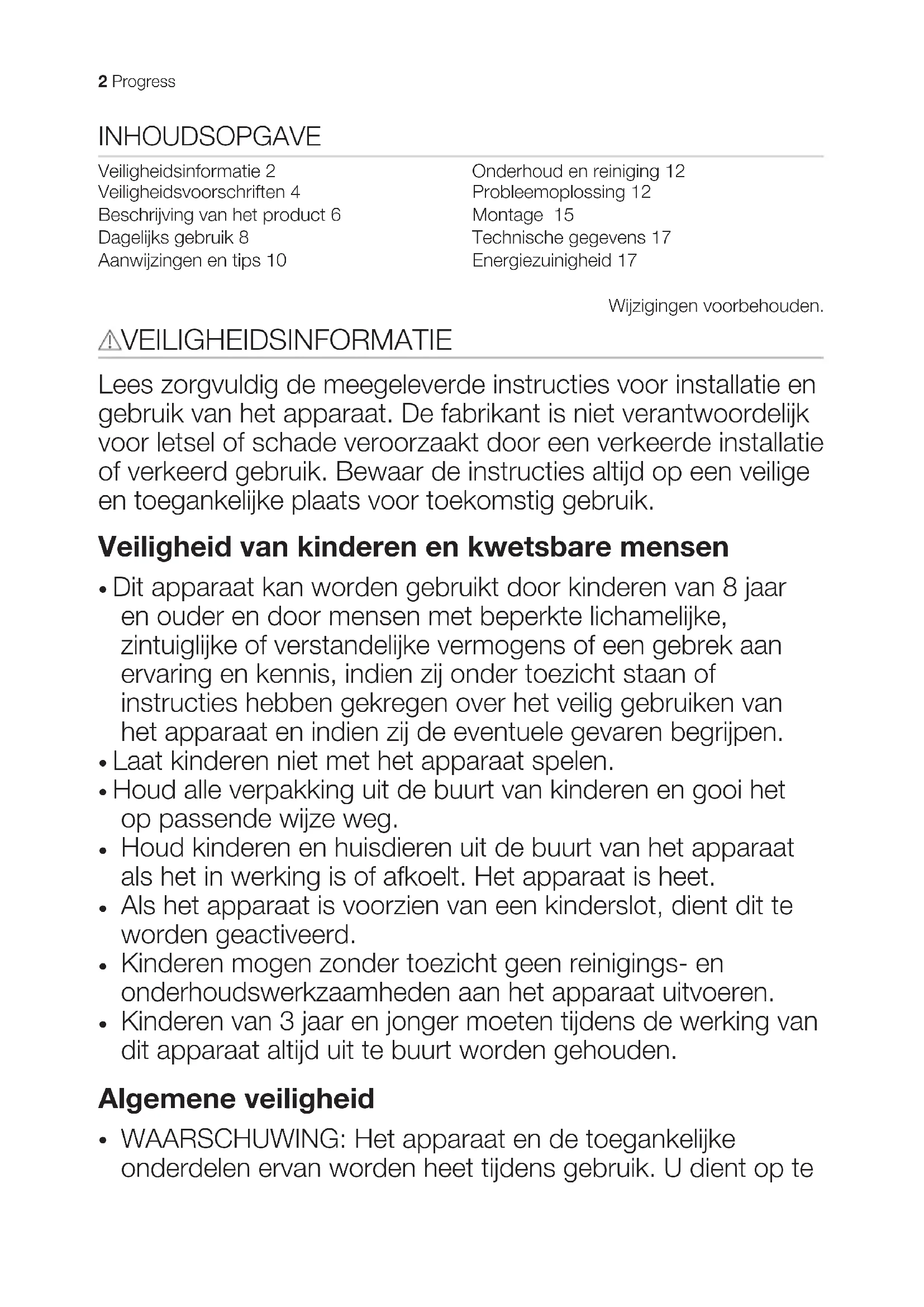 - Gebruik de restwarmte om het eten warm te houden of te smelten. MILIEUBESCHERMING Recycle de materialen met het symbool . Gooi de verpakking in een geschikte verzamelcontainer om het te recyclen. Help om het milieu en de volksgezondheid te beschermen en recycle het afval van elektrische en elektronische apparaten. Gooi apparaten gemarkeerd met het symbool niet weg met het huishoudelijk afval. Breng het product naar het milieustation bij u in de buurt of neem contact op met de gemeente. 18 ProgressCONTENTS Safety information 19 Safety instructions 20 Product description 23 Daily use 24 Hints and tips 27 Care and cleaning 28 Troubleshooting 29 Installation 31 Technical data 33 Energy efficiency 34 Subject to change without notice. SAFETY INFORMATION Before the installation and use of the appliance, carefully read the supplied instructions. The manufacturer is not responsible for any injuries or damages that are the result of incorrect installation or usage. Always keep the instructions in a safe and accessible location for future reference. Children and vulnerable people safety