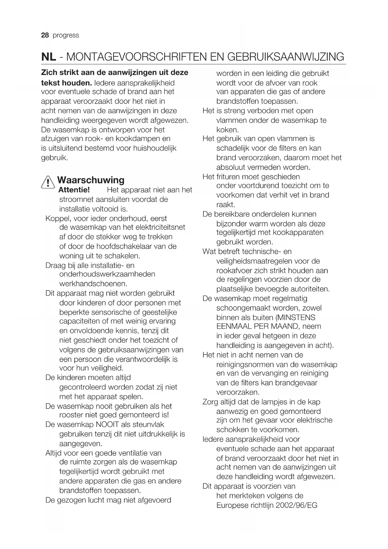 Zich strikt aan de aanwijzingen uit deze tekst houden. Iedere aansprakelijkheid voor eventuele schade of brand aan het apparaat veroorzaakt door het niet in acht nemen van de aanwijzingen in deze handleiding weergegeven wordt afgewezen. De wasemkap is ontworpen voor het afzuigen van rook- en kookdampen en is uitsluitend bestemd voor huishoudelijk gebruik. Waarschuwing Attentie! Het apparaat niet aan het stroomnet aansluiten voordat de installatie voltooid is. Koppel, voor ieder onderhoud, eerst de wasemkap van het elektriciteitsnet af door de stekker weg te trekken of door de hoofdschakelaar van de woning uit te schakelen. Draag bij alle installatie- en onderhoudswerkzaamheden werkhandschoenen. Dit apparaat mag niet worden gebruikt door kinderen of door personen met beperkte sensorische of geestelijke capaciteiten of met weinig ervaring en onvoldoende kennis, tenzij dit niet geschiedt onder het toezicht of volgens de gebruiksaanwijzingen van een persoon die verantwoordelijk is voor hun veiligheid. De kinderen moeten altijd gecontroleerd worden zodat zij niet met het apparaat spelen. De wasemkap nooit gebruiken als het rooster niet goed gemonteerd is! De wasemkap NOOIT als steunvlak gebruiken tenzij dit niet uitdrukkelijk is aangegeven. Altijd voor een goede ventilatie van de ruimte zorgen als de wasemkap tegelijkertijd wordt gebruikt met andere apparaten die gas en andere brandstoffen toepassen. De gezogen lucht mag niet afgevoerd worden in een leiding die gebruikt wordt voor de afvoer van rook van apparaten die gas of andere brandstoffen toepassen. Het is streng verboden met open vlammen onder de wasemkap te koken. Het gebruik van open vlammen is schadelijk voor de filters en kan brand veroorzaken, daarom moet het absoluut vermeden worden. Het frituren moet geschieden onder voortdurend toezicht om te voorkomen dat verhit vet in brand raakt. De bereikbare onderdelen kunnen bijzonder warm worden als deze tegelijkertijd met kookapparaten gebruikt worden. Wat betreft technische- en veiligheidsmaatregelen voor de rookafvoer zich strikt houden aan de regelingen voorzien door de plaatselijke bevoegde autoriteiten. De wasemkap moet regelmatig schoongemaakt worden, zowel binnen als buiten (MINSTENS EENMAAL PER MAAND, neem in ieder geval hetgeen in deze handleiding is aangegeven in acht). Het niet in acht nemen van de reinigingsnormen van de wasemkap en van de vervanging en reiniging van de filters kan brandgevaar veroorzaken. Zorg altijd dat de lampjes in de kap aanwezig en goed gemonteerd zijn om het gevaar voor elektrische schokken te voorkomen. Iedere aansprakelijkheid voor eventuele schade aan het apparaat of brand veroorzaakt door het niet in acht nemen van de aanwijzingen uit deze handleiding wordt afgewezen. Dit apparaat is voorzien van het merkteken volgens de Europese richtlijn 2002/96/EGprogress 29 inzake Afgedankte elektrische en elektronische apparaten (AEEA). Door ervoor te zorgen dat dit product op de juiste manier als afval wordt verwerkt, helpt u mogelijk negatieve consequenties voor het milieu en de menselijke gezondheid te voorkomen die anders zouden kunnen worden veroorzaakt door onjuiste verwerking van dit product als afval. Het symbool op het product of op de bijbehorende documentatie geeft aan dat dit product niet als huishoudelijk afval mag worden behandeld. In plaats daarvan moet het worden afgegeven bij een ver- zamelpunt voor recycling van elek- trische en elektronische apparaten. Afdanking moet worden uitgevoerd in overeenstemming met de plaatsel- ijke milieuvoorschriften voor afval- verwerking. Voor nadere informatie over de behandeling, terugwinning en recycling van dit product wordt u verzocht contact op te nemen met het stadskantoor in uw woonplaats, uw afvalophaaldienst of de winkel waar u het product heeft aangeschaft. Het gebruik De kap is vervaardigd voor gebruik in de afzuigversie met afvoer naar buiten