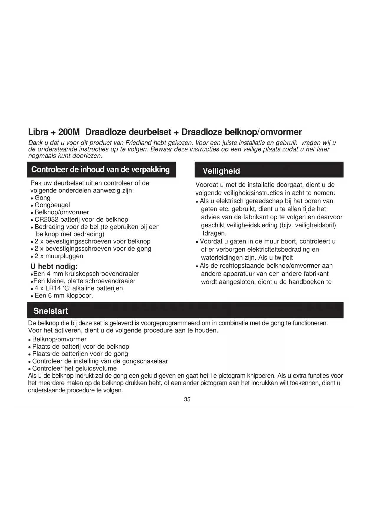 Standaard aansluitingen42 Een ‘beep’-geluiden wordt tijdens de leermodus weergegeven… ● De belknop die u programmeert werd reeds door de gong geleerd. ● Als u het pictogram gerelateerd aan de belknop wilt wijzigen, maakt u gebruik van de wisprocedure, programmeert u de belknop weer. Twee ‘beep’-geluiden worden na de normale melodie van de gong weergegeven… ● Dit geeft aan dat de batterij in de belknop die de gong activeert bijna leeg is. Plaats een nieuwe batterij, type Als de belknop wordt geactiveerd en de amberkleurige verlichting niet oplicht of slechts gedurende een korte tijd… ● Bij een normale werking, zal de amberkleurige verlichting gedurende 1 seconde oplichten. Als de batterij bijna leeg is, zal het licht alleen gedurende korte tijd oplichten. Plaats een batterij, type CR2032. De gong werk niet… ● Controleer of de batterijen van het juiste type zijn, t.w. .Gebruik alleen alkaline batterijen. ● Controleer of de batterijen op de juiste wijze zijn geplaatst. ● Het kan zijn dat de gong buiten het bereik van de belknop staat opgesteld. Probeer om de gong op een andere locatie te plaatsen. ● Het kan zijn dat de gong de identiteit van de functie van de belknop nog niet heeft geleerd. Volg de programmeerprocedure. De gong geeft geen geluid… ● Controleer de ingestelde stand van de gong. ● Controleer of het geluidsniveau niet op de minimale stand staat ingesteld. De gong geeft geen geluid… ● Controleer of het geluidsniveau niet op de minimale stand staat ingesteld. Probleemoplossing43 Het bereik is gereduceerd… ● Metalen structuren, inclusief PVC-deurframes kunnen het bereik van het product beperken. Voorkom het installeren van de belknop of gong op of bij een metalen structureren. ● Overig apparatuur kunnen radio-interferentie veroorzaken, die van invloed zijn op uw gong. ● Muren en plafonds beperken het bereik. ● Zwakke batterijen zullen het bereik beperken. Batterijen dien 1 x per 12 –18 maanden ver vangen te worden. In koude omstandigheden, (minder dan 5ºC), batterijen dienen mogelijk vaker vervangen te worden. Den ravgule lampe blinker… ● Når dørklokkens batteri er lavt, lyser en ravgul lampe hvert 5. sekund. Isæt nye batterier i dørklokken. Gebruik alleen alkaline batterijen. Amberkleurig licht knippert… ● Als de batterij van de gong bijna leeg is, zal elke 5 seconden een amberkleurige lichtje knipperen. Plaats nieuwe batterijen in de gong en gebruik hiervoor type LR14 ‘C’ cellen. Gebruik alleen alkaline batterijen Als de signaalomzetter van de belknop is gebruikt, werkt de gong niet… ● Controleer of de bedrading naar de belknop juist is aangesloten. ● Controleer of de juiste aansluitingspunten terminals zijn gebruikt en de schroeven aangedraaid zijn. Gong / belknop werk niet met mijn oudere apparatuur van Libra… ● Libra + is niet compatibel met eerdere Libra-systemen. ● Gebruik alleen accessoires met de markering Libra +.44 Friedland, The Arnold Centre, Paycocke Road, Basildon, Essex, SS14 3EA www.friedland.co.uk Friedland garandeert dit product voor een periode van 2 jaar vanaf de datum van aankoop. Een bewijs van aankoop is vereist; dit geeft geen invloed op uw wettelijke recht- en. Als u meer informatie over ons product wenst kunt u contact opne- men met de Friedland helpline op