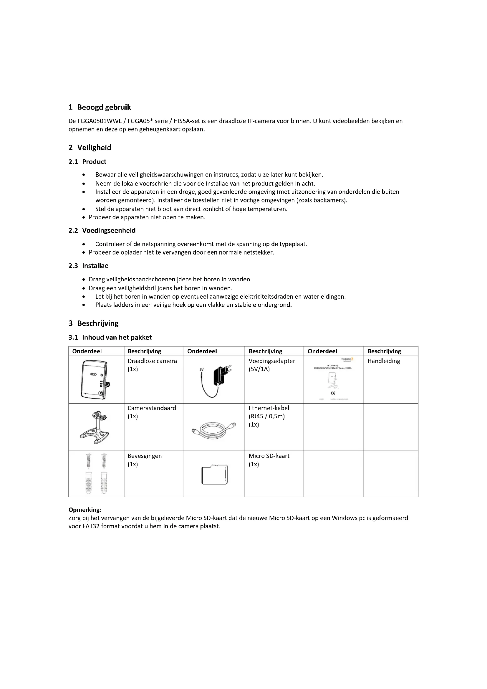 Installeer voordat u de FGGA0501WWE / FGGA05*-serie / HIS5A-set installeert een GlobalGuard huisalarmsysteem en maak een online account aan. Besturingssysteem Windows XP / Windows Vista / Windows 7 Webbrowser Internet Explorer 6.x (of hoger) Centrale verwerkingseenheid (CVE) Pentium 4: 1 GHz (of hoger) Resolutie VGA-kaart 800 x 600 (of hoger) Omvang videogeheugen 128 Mb (of meer) Internet-bandbreedte 512 kbps (aanbevolen uploadsnelheid voor 1 camera) Geheugenkaart Micro SD: 4 GB (aanwezig) / 32 GB (ondersteund) 4 Overzicht