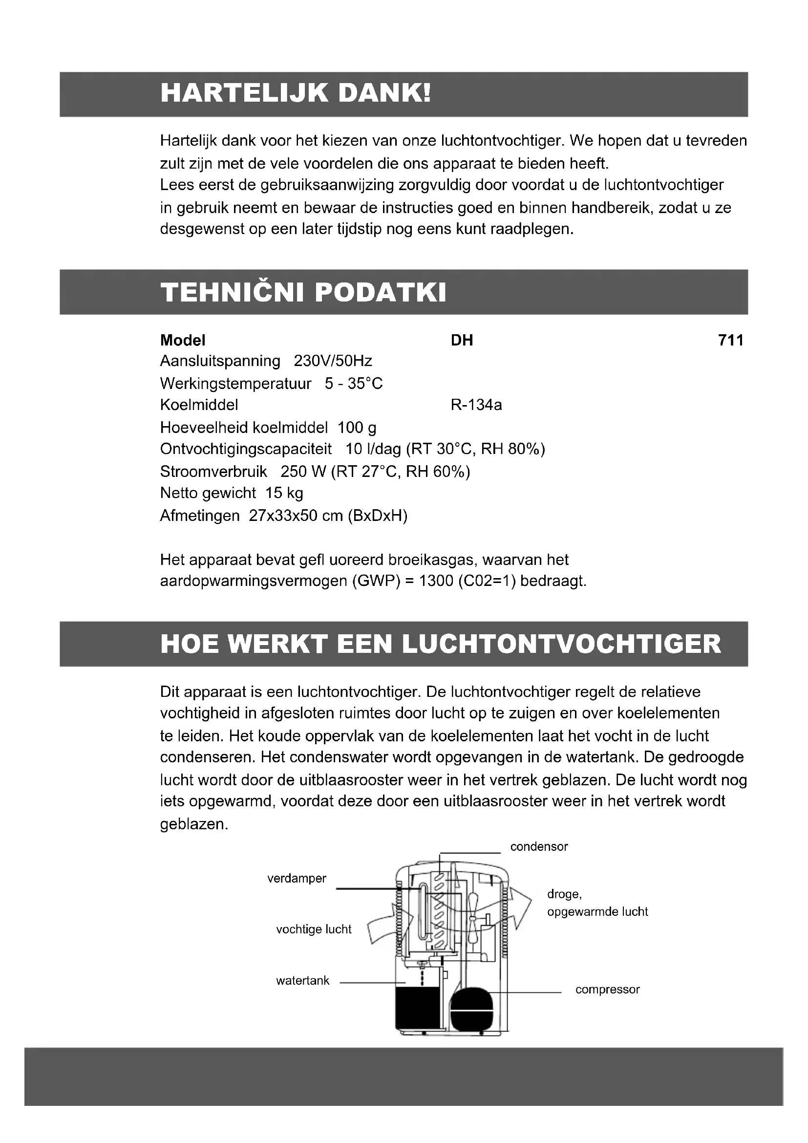 =1) Urządzenie zawiera fluorowany gaz cieplarniany, jego wspóáczynnik ocieplenia globalnego wynosi (GWP) = 1300 droge, opgewarmde luchtcompressorcondensorwatertankvochtige luchtverdamper HARTELIJK DANK! Hartelijk dank voor het kiezen van onze luchtontvochtiger. We hopen dat u tevreden zult zijn met de vele voordelen die ons apparaat te bieden heeft. Lees eerst de gebruiksaanwijzing zorgvuldig door voordat u de luchtontvochtiger in gebruik neemt en bewaar de instructies goed en binnen handbereik, zodat u ze desgewenst op een later tijdstip nog eens kunt raadplegen.