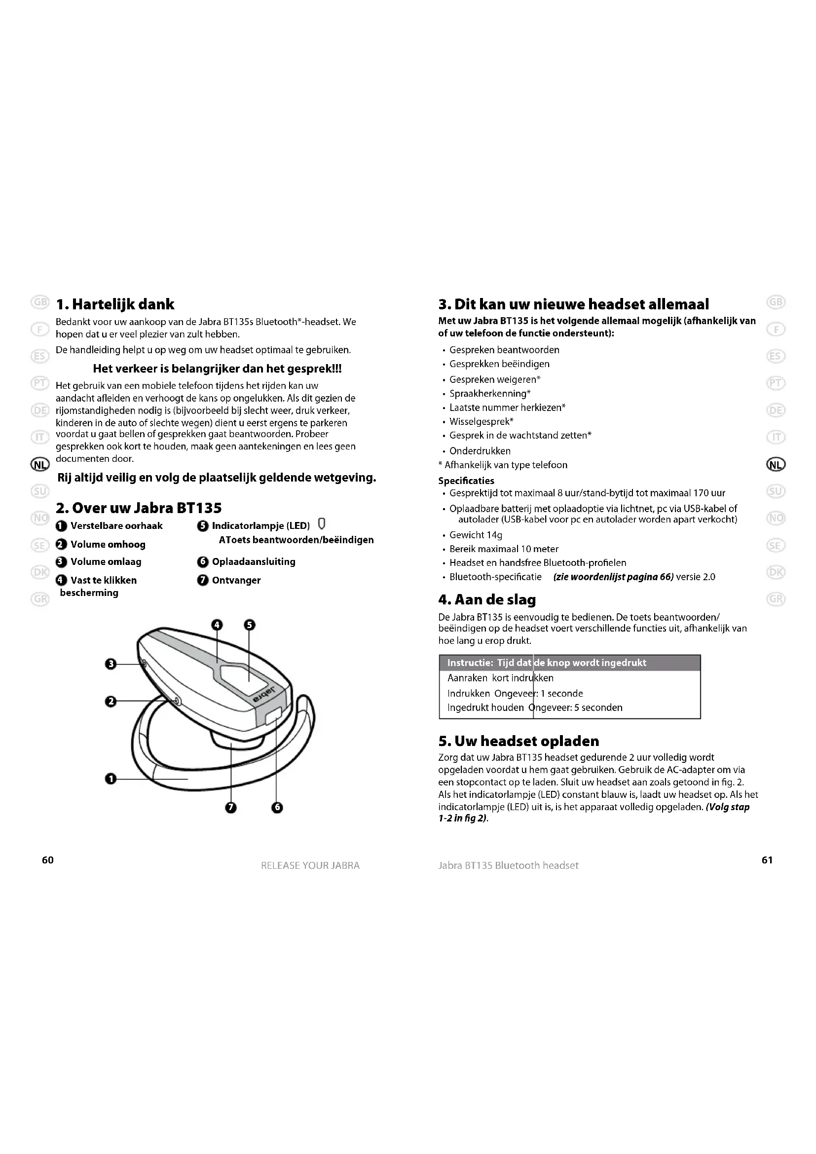 Bedankt voor uw aankoop van de Jabra BT135s Bluetooth®-headset. We hopen dat u er veel plezier van zult hebben. De handleiding helpt u op weg om uw headset optimaal te gebruiken. Het verkeer is belangrijker dan het gesprek!!! Het gebruik van een mobiele telefoon tijdens het rijden kan uw aandacht aeiden en verhoogt de kans op ongelukken. Als dit gezien de rijomstandigheden nodig is (bijvoorbeeld bij slecht weer, druk verkeer, kinderen in de auto of slechte wegen) dient u eerst ergens te parkeren voordat u gaat bellen of gesprekken gaat beantwoorden. Probeer gesprekken ook kort te houden, maak geen aantekeningen en lees geen documenten door. Rij altijd veilig en volg de plaatselijk geldende wetgeving.