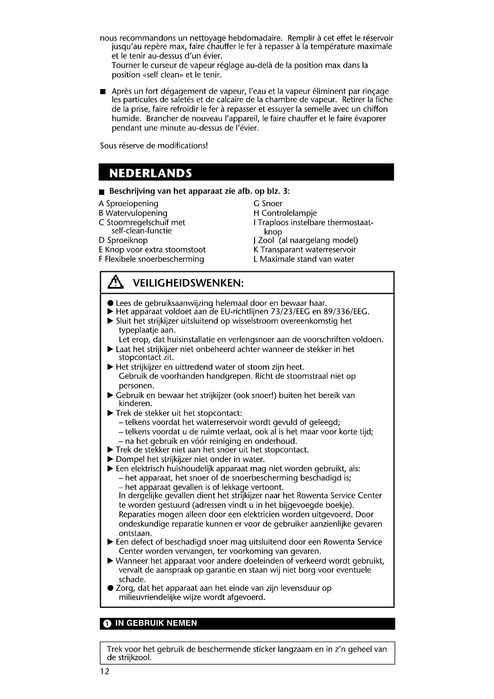 Trek voor het gebruik de beschermende sticker langzaam en in z’n geheel van de strijkzool. VEILIGHEIDSWENKEN: P Lees de gebruiksaanwijzing helemaal door en bewaar haar. E Het apparaat voldoet aan de EU-richtlijnen 73/23/EEG en 89/336/EEG. E Sluit het strijkijzer uitsluitend op wisselstroom overeenkomstig het typeplaatje aan. Let erop, dat huisinstallatie en verlengsnoer aan de voorschriften voldoen. E Laat het strijkijzer niet onbeheerd achter wanneer de stekker in het stopcontact zit. E Het strijkijzer en uittredend water of stoom zijn heet. Gebruik de voorhanden handgrepen. Richt de stoomstraal niet op personen. E Gebruik en bewaar het strijkijzer (ook snoer!) buiten het bereik van kinderen. E Trek de stekker uit het stopcontact: – telkens voordat het waterreservoir wordt gevuld of geleegd; – telkens voordat u de ruimte verlaat, ook al is het maar voor korte tijd; – na het gebruik en vóór reiniging en onderhoud. E Trek de stekker niet aan het snoer uit het stopcontact. E Dompel het strijkijzer niet onder in water. E Een elektrisch huishoudelijk apparaat mag niet worden gebruikt, als: – het apparaat, het snoer of de snoerbescherming beschadigd is; – het apparaat gevallen is of lekkage vertoont. In dergelijke gevallen dient het strijkijzer naar het Rowenta Service Center te worden gestuurd (adressen vindt u in het bijgevoegde boekje). Reparaties mogen alleen door een elektricien worden uitgevoerd. Door ondeskundige reparatie kunnen er voor de gebruiker aanzienlijke gevaren ontstaan. E Een defect of beschadigd snoer mag uitsluitend door een Rowenta Service Center worden vervangen, ter voorkoming van gevaren. E Wanneer het apparaat voor andere doeleinden of verkeerd wordt gebruikt, vervalt de aanspraak op garantie en staan wij niet borg voor eventuele schade. P Zorg, dat het apparaat aan het einde van zijn levensduur op milieuvriendelijke wijze wordt afgevoerd.13DM-100