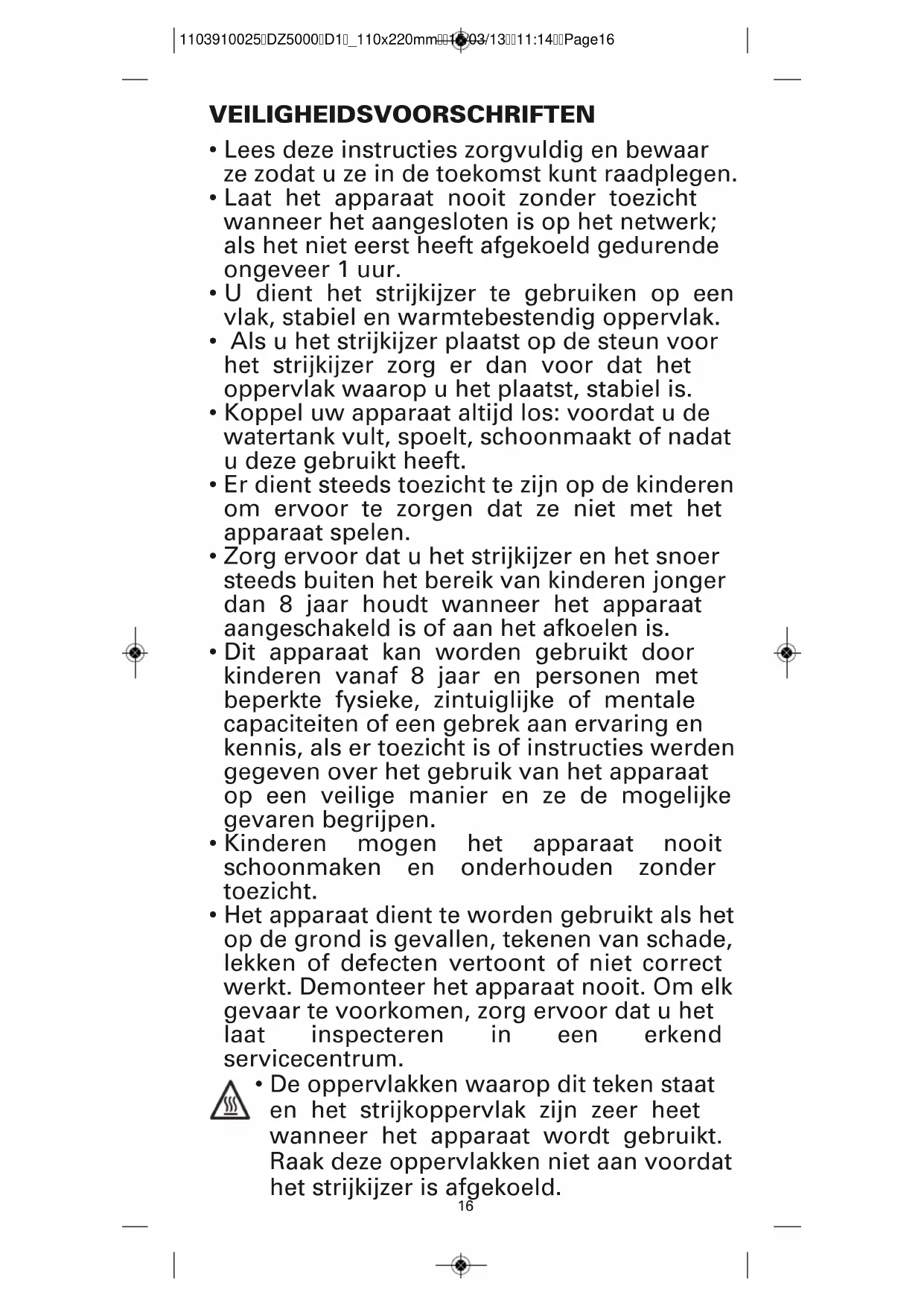 - De oppervlakken waarop dit teken staat en het strijkoppervlak zijn zeer heet wanneer het apparaat wordt gebruikt. Raak deze oppervlakken niet aan voordat het strijkijzer is afgekoeld. 1103910025DZ5000D1_110x220mm15/03/1311:14Page1617