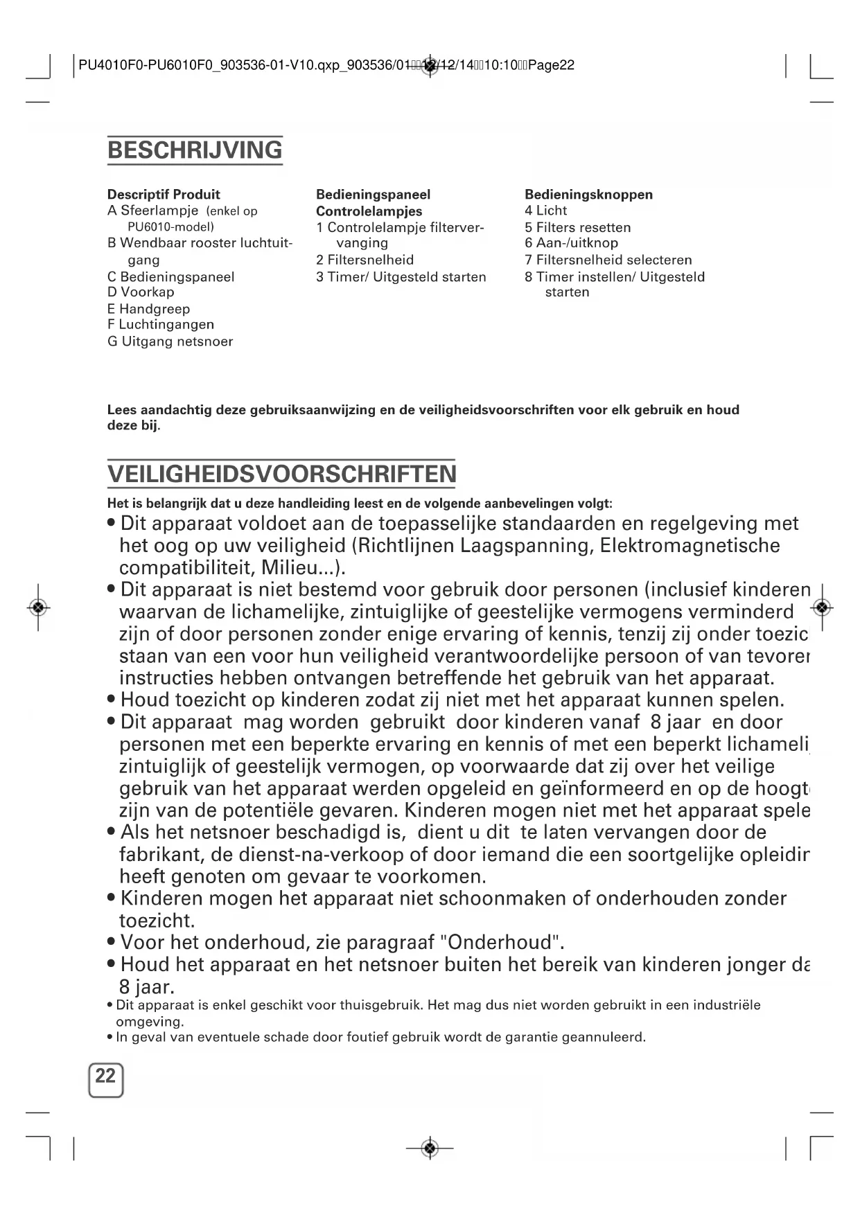 - In geval van eventuele schade door foutief gebruik wordt de garantie geannuleerd. Descriptif Produit A Sfeerlampje (enkel op PU6010-model) B Wendbaar rooster luchtuit- gang C Bedieningspaneel D Voorkap E Handgreep F Luchtingangen G Uitgang netsnoer Bedieningspaneel Controlelampjes 1 Controlelampje filterver- vanging 2 Filtersnelheid 3 Timer/ Uitgesteld starten Bedieningsknoppen 4 Licht 5 Filters resetten 6 Aan-/uitknop 7 Filtersnelheid selecteren 8 Timer instellen/ Uitgesteld starten PU4010F0-PU6010F0_903536-01-V10.qxp_903536/0112/12/1410:10Page2223