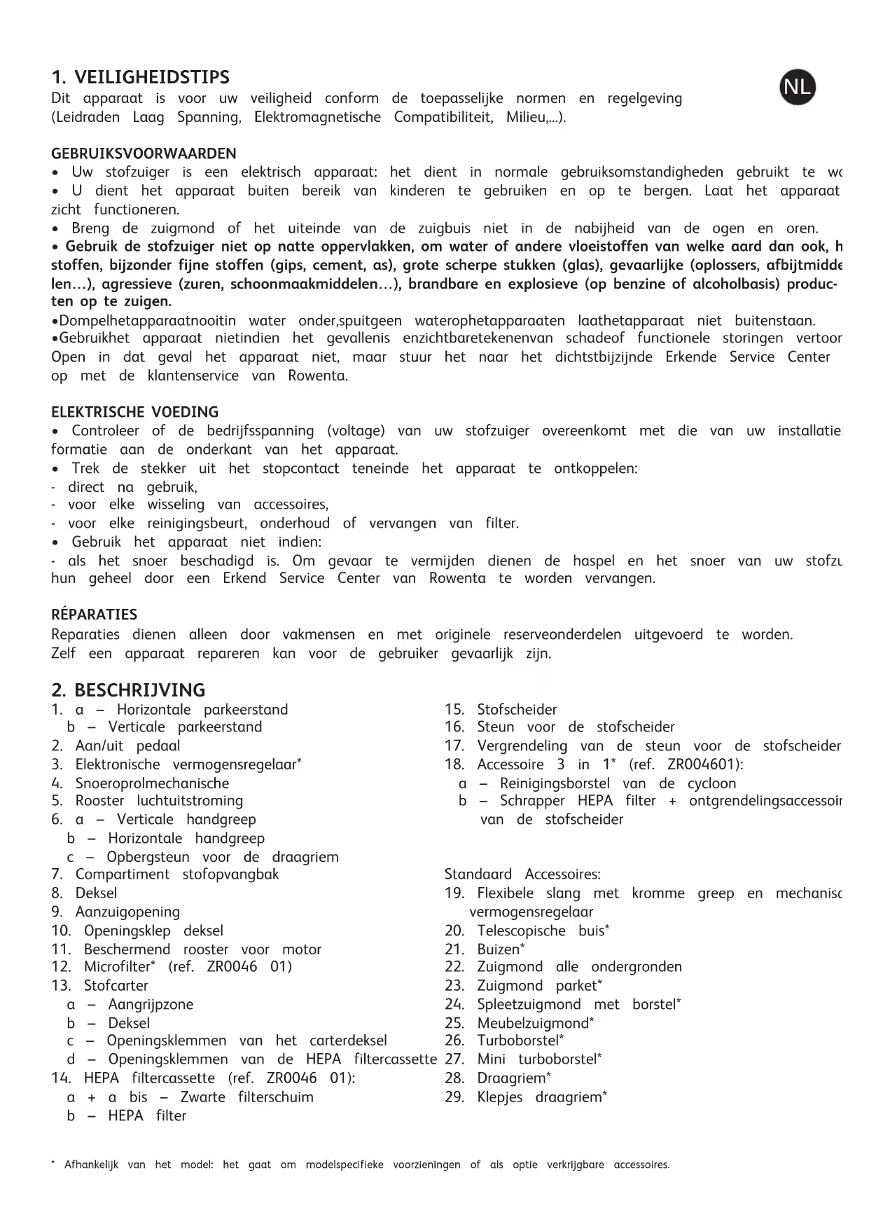 - Afhankelijk van het model: het gaat om modelspecifieke voorzieningen of als optie verkrijgbare accessoires. 902186_Not Compacteo cyclonic:902186 5/06/09 9:27 Page 39NL