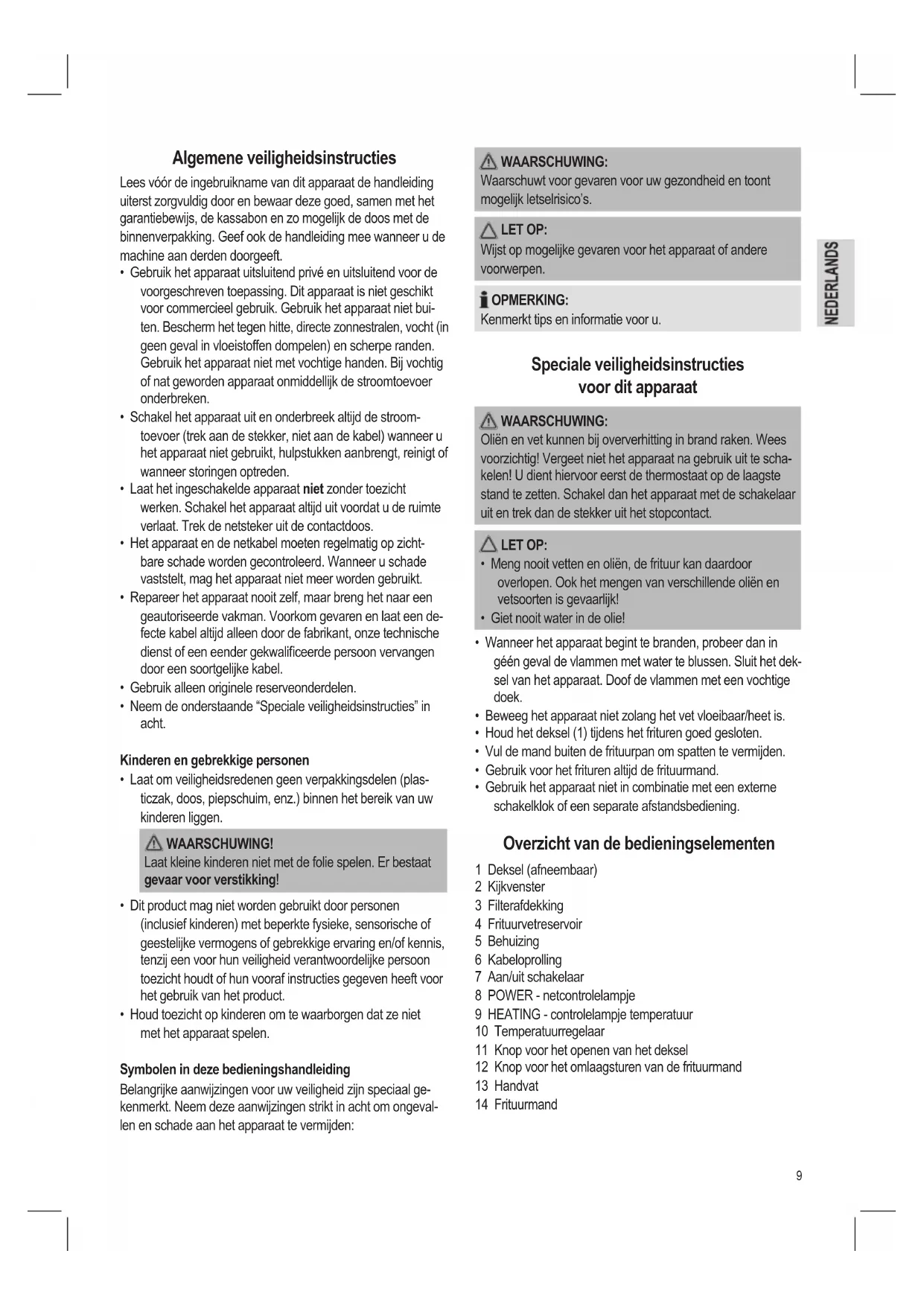 Kenmerkt tips en informatie voor u. Speciale veiligheidsinstructies voor dit apparaat WAARSCHUWING: Oliën en vet kunnen bij oververhitting in brand raken. Wees voorzichtig! Vergeet niet het apparaat na gebruik uit te scha- kelen! U dient hiervoor eerst de thermostaat op de laagste stand te zetten. Schakel dan het apparaat met de schakelaar uit en trek dan de stekker uit het stopcontact. LET OP: