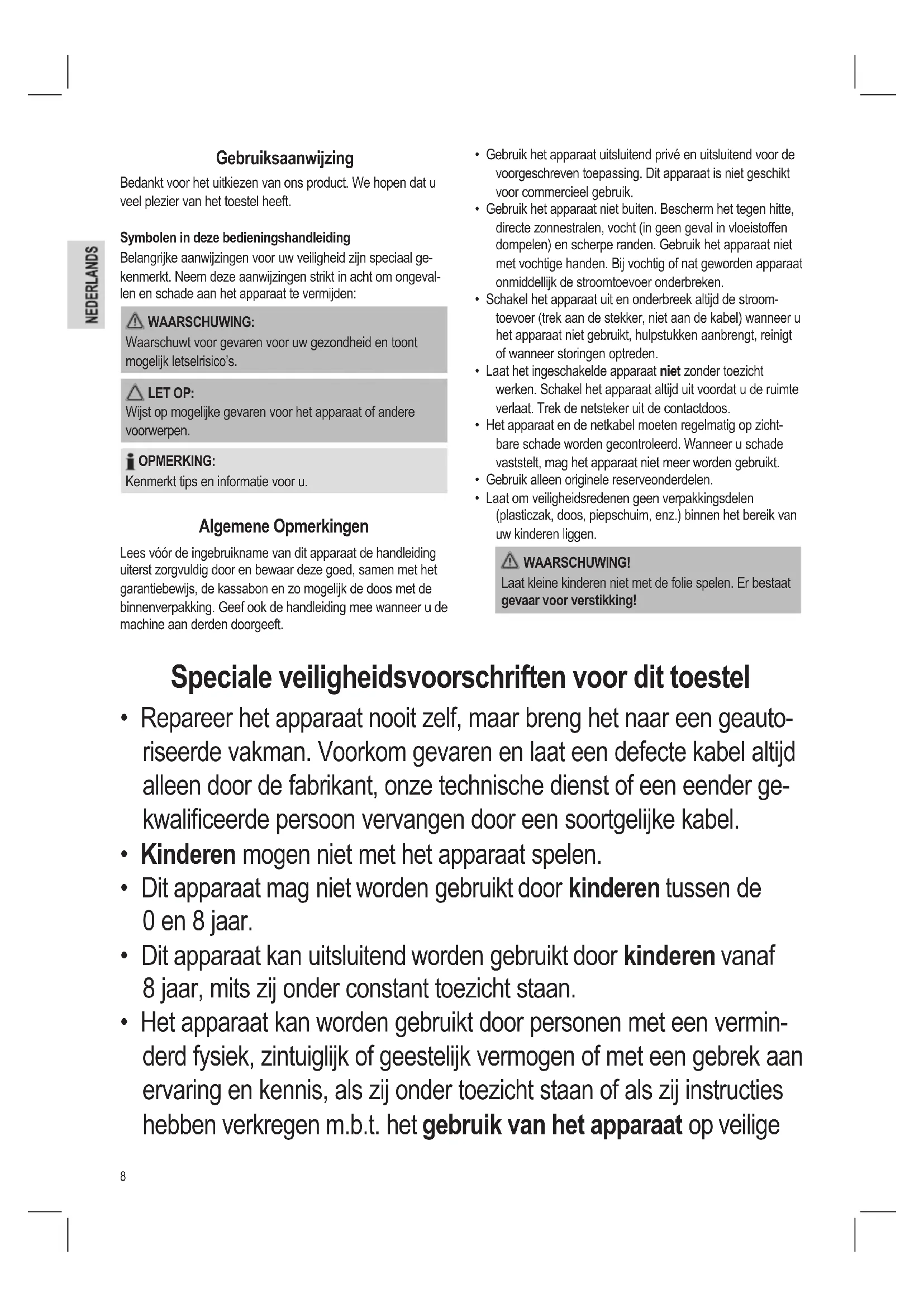 - Dit apparaat kan uitsluitend worden gebruikt door kinderen vanaf 8 jaar, mits zij onder constant toezicht staan.