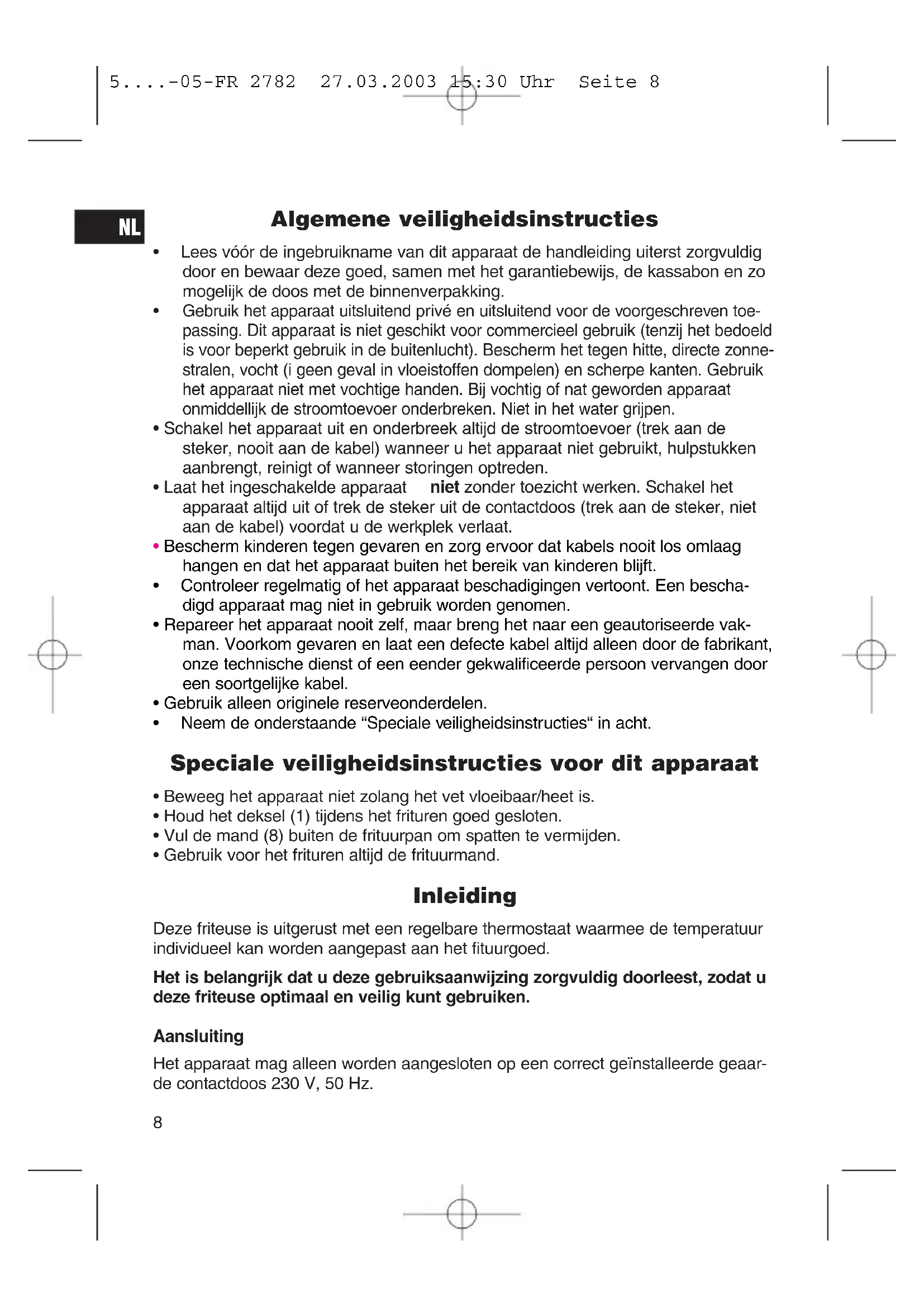 - Gebruik voor het frituren altijd de frituurmand. Inleiding Deze friteuse is uitgerust met een regelbare thermostaat waarmee de temperatuur individueel kan worden aangepast aan het fituurgoed. Het is belangrijk dat u deze gebruiksaanwijzing zorgvuldig doorleest, zodat u deze friteuse optimaal en veilig kunt gebruiken. Aansluiting Het apparaat mag alleen worden aangesloten op een correct geïnstalleerde geaar- de contactdoos 230 V, 50 Hz.
