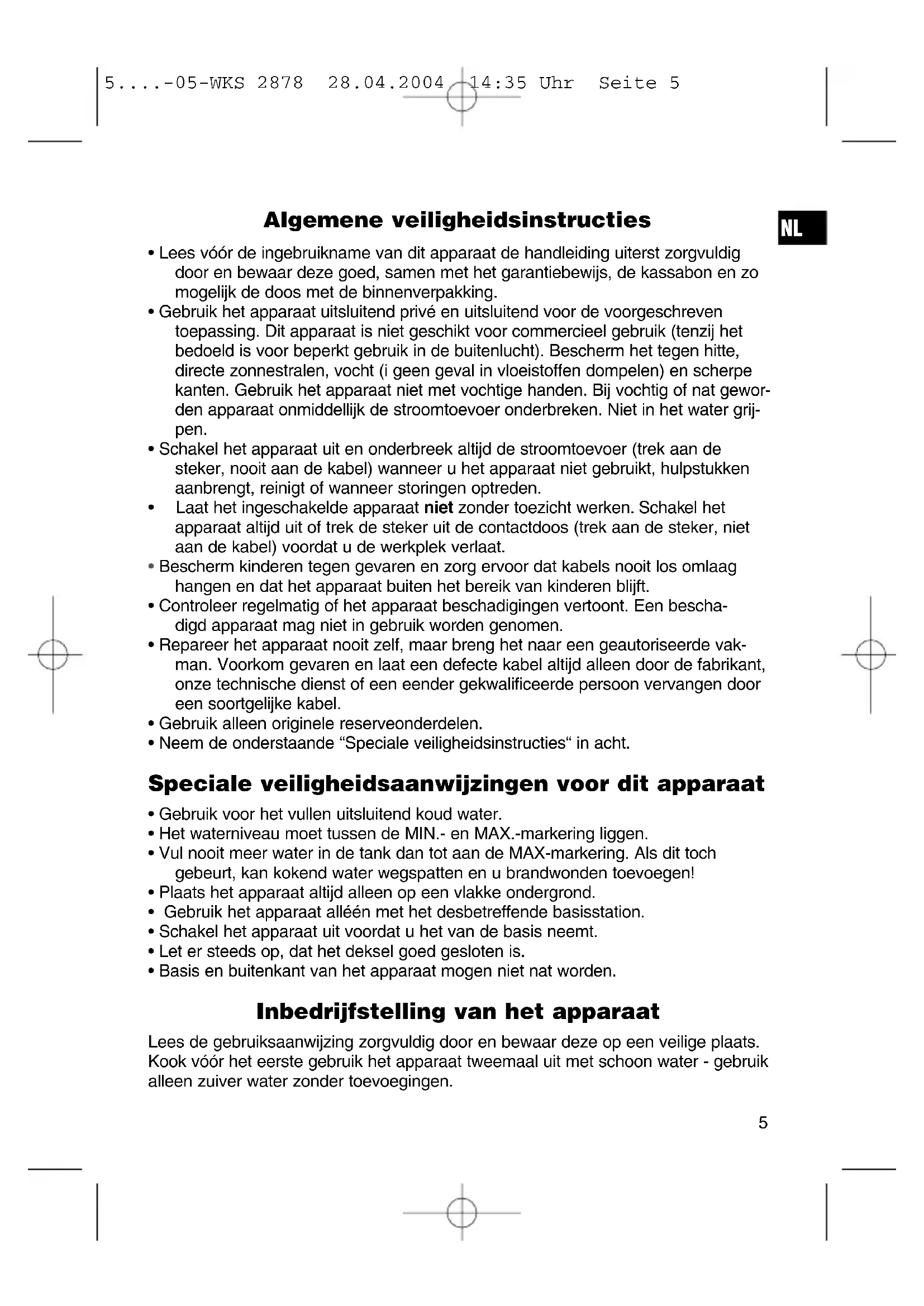 5....-05-WKS 2878 28.04.2004 14:35 Uhr Seite 6Garantie Voor het door ons geleverde apparaat verlenen wij een garantie van 24 maanden vanaf koopdatum (kassabon). Eventuele gebreken aan het apparaat of aan het toebehoren*) die zijn ontstaan door productie- of materiaalfouten verhelpen wij binnen deze periode kosteloos door middel van reparatie of, naar ons oordeel, door vervanging. Eventuele garan- tiegevallen verlengen noch de geldigheidsduur van de garantie, noch begint daar- door een nieuwe garantieperiode! Het koopbewijs geldt als garantiebewijs. Zonder dit bewijs kan geen kosteloze reparatie of vervanging plaatsvinden. Geef in garantiegevallen het complete apparaat in de originele verpakking samen met de kassabon af bij uw handelaar. *) Schade aan onderdelen leidt niet automatisch tot kosteloze vervanging van het complete apparaat. Neem in dit geval contact op met onze hotline! De reparatie van glasbreuk of breuk van kunststofonderdelen wordt altijd berekend! Niet defecten aan de hulpstukken of aan de slijtende onderdelen (bijv. koolborstels, deeghaken, drijfriemen, reserveafstandsbediening, reservetandenborstels, zaag- bladen enz.), maar ook reiniging, onderhoud of de vervanging van slijtende delen vallen niet onder de garantie en geschieden altijd tegen berekening! Bij ingrepen door derden komt de garantieverlening te vervallen. Na de garantieperiode Na afloop van de garantieperiode kunnen reparaties tegen berekening worden uit- gevoerd door de betreffende vakhandelaar of de technische dienst.