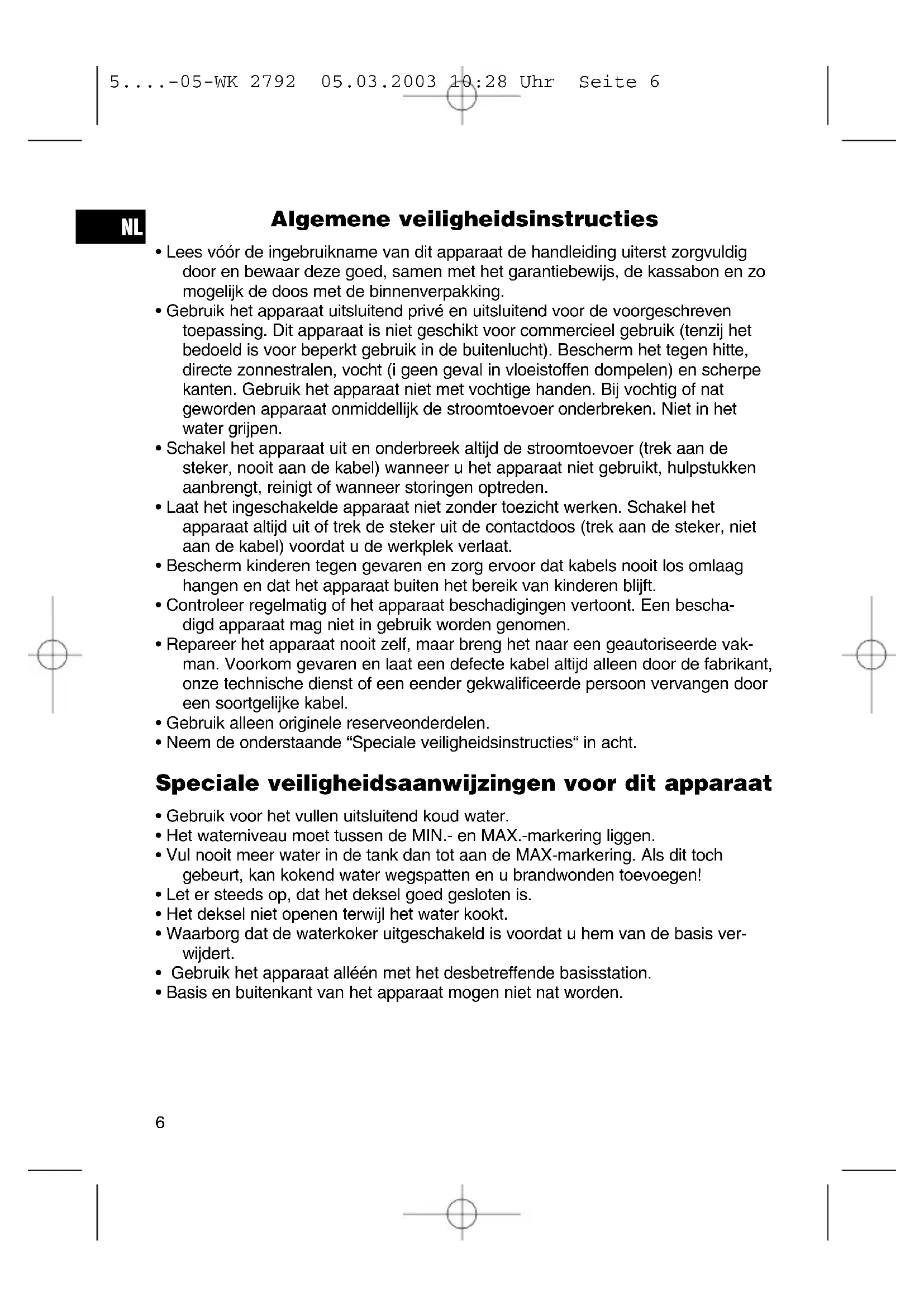 5....-05-WK 2792 05.03.2003 10:28 Uhr Seite 6Inbedrijfstelling van het apparaat Lees de gebruiksaanwijzing zorgvuldig door en bewaar deze op een veilige plaats. Kook vóór het eerste gebruik het apparaat tweemaal uit met schoon water - gebruik alleen zuiver water zonder toevoegingen. Bediening
