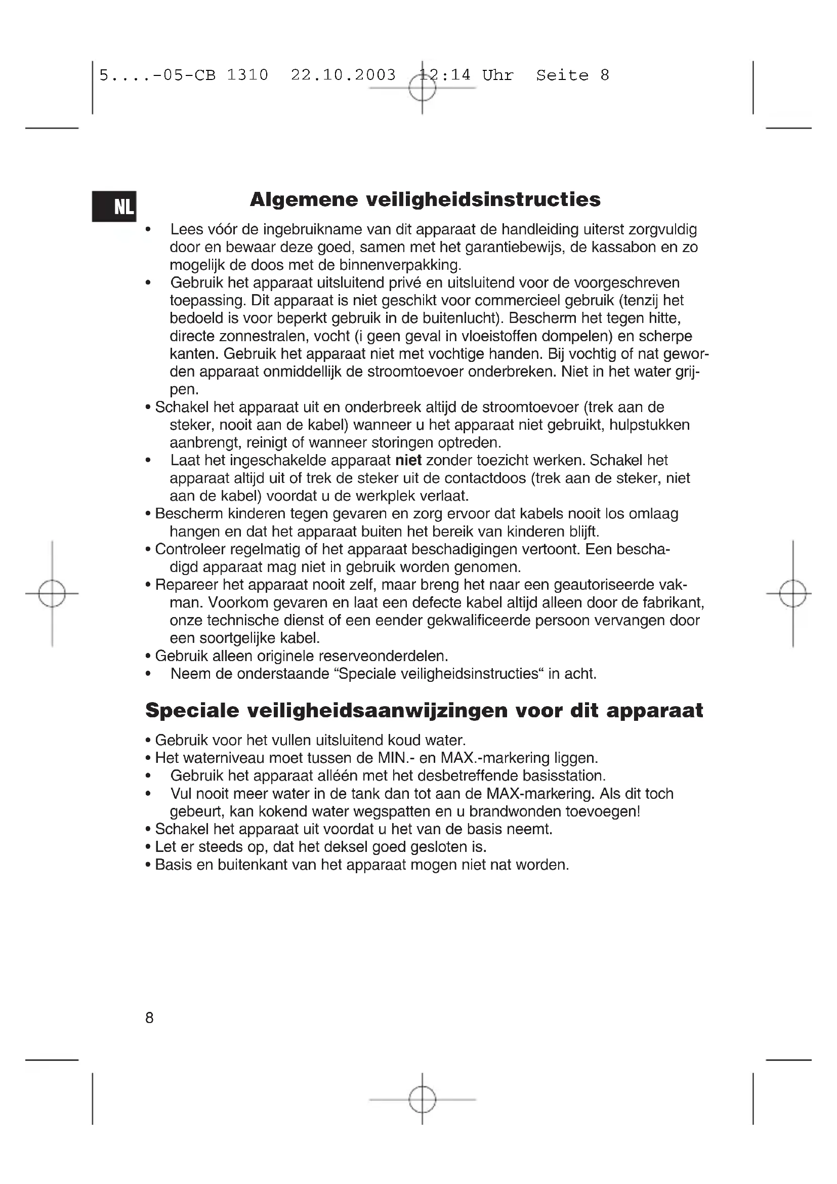 5....-05-CB 1310 22.10.2003 12:14 Uhr Seite 8Overzicht van de bedieningselementen Basis 1 Aan/uitschakelaar voor de warmhoudplaat 2 Warmhoudplaat 3 Controlelampje voor de warmhoudplaat 4 Aansluiting waterkoker 5 Netkabel Theekan 6 Deksel 7 Handvat 8 Theefilter Waterkoker 9 Deksel 10 Aan/uitschakelaar 11 Waterpeilglas 12 Schenkopening met kalkfilter 13 Elektrische aansluiting naar de basis Inbedrijfstelling van het apparaat Lees de gebruiksaanwijzing zorgvuldig door en bewaar deze op een veilige plaats. Spoel vóór het eerste gebruik de theekan een keer om en kook de waterkoker twee keer uit met vers water. Gebruik alleen zuiver water zonder toevoegingen. Elektrische aansluiting