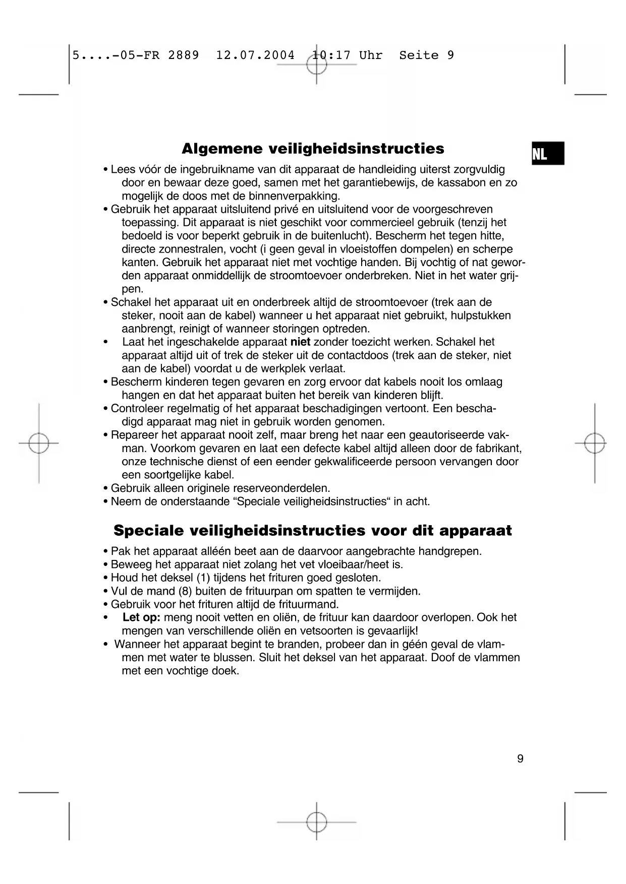 5....-05-FR 2889 12.07.2004 10:17 Uhr Seite 9Overzicht van de bedieningselementen Inleiding Deze friteuse is uitgerust met een regelbare thermostaat waarmee de temperatuur individueel kan worden aangepast aan het fituurgoed. Het is belangrijk dat u deze gebruiksaanwijzing zorgvuldig doorleest, zodat u deze friteuse optimaal en veilig kunt gebruiken. Aansluiting Het apparaat mag alleen worden aangesloten op een correct geïnstalleerde geaar- de contactdoos 230 V, 50 Hz. Ingebruikname Vóór de eerste ingebruikname