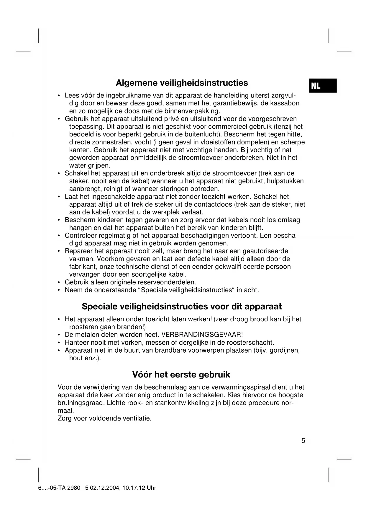 Voor de verwijdering van de beschermlaag aan de verwarmingsspiraal dient u het apparaat drie keer zonder enig product in te schakelen. Kies hiervoorde hoogste bruiningsgraad. Lichte rook- en stankontwikkeling+zijn bij deze procedure normal.