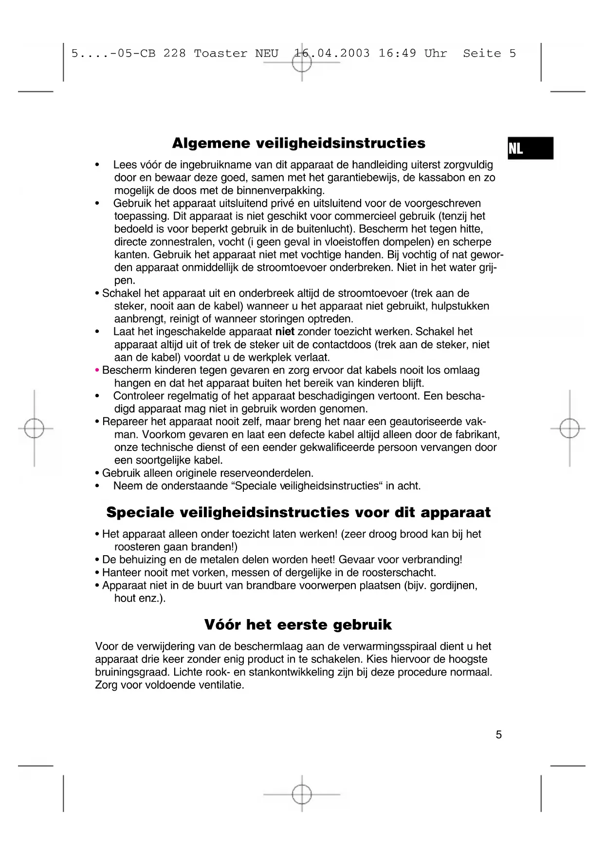5....-05-CB 228 Toaster NEU 16.04.2003 16:49 Uhr Seite 6Dit apparaat is gekeurd conform de op dit moment van toepassing zijnde CE- richtlijnen zoals bijvoorbeeld elektromagnetische compatibiliteit en laagspannings- voorschriften en is geconstrueerd volgens de nieuwste veiligheidstechnische voor- schriften. Technische wijzigingen voorbehouden! Garantie Voor het door ons geleverde apparaat verlenen wij een garantie van 24 maanden vanaf koopdatum (kassabon). Eventuele gebreken aan het apparaat of aan het toebehoren*) die zijn ontstaan door productie- of materiaalfouten verhelpen wij binnen deze periode kosteloos door middel van reparatie of, naar ons oordeel, door vervanging. Eventuele garan- tiegevallen verlengen noch de geldigheidsduur van de garantie, noch begint daar- door een nieuwe garantieperiode! Het koopbewijs geldt als garantiebewijs. Zonder dit bewijs kan geen kosteloze reparatie of vervanging plaatsvinden. Geef in garantiegevallen het complete apparaat in de originele verpakking samen met de kassabon af bij uw handelaar. *) Schade aan onderdelen leidt niet automatisch tot kosteloze vervanging van het complete apparaat. Neem in dit geval contact op met onze hotline! De reparatie van glasbreuk of breuk van kunststofonderdelen wordt altijd berekend! Niet defecten aan de hulpstukken of aan de slijtende onderdelen (bijv. koolborstels, deeghaken, drijfriemen, reserveafstandsbediening, reservetandenborstels, zaag- bladen enz.), maar ook reiniging, onderhoud of de vervanging van slijtende delen vallen niet onder de garantie en geschieden altijd tegen berekening! Bij ingrepen door derden komt de garantieverlening te vervallen. Na de garantieperiode Na afloop van de garantieperiode kunnen reparaties tegen berekening worden uit- gevoerd door de betreffende vakhandelaar of de technische dienst.