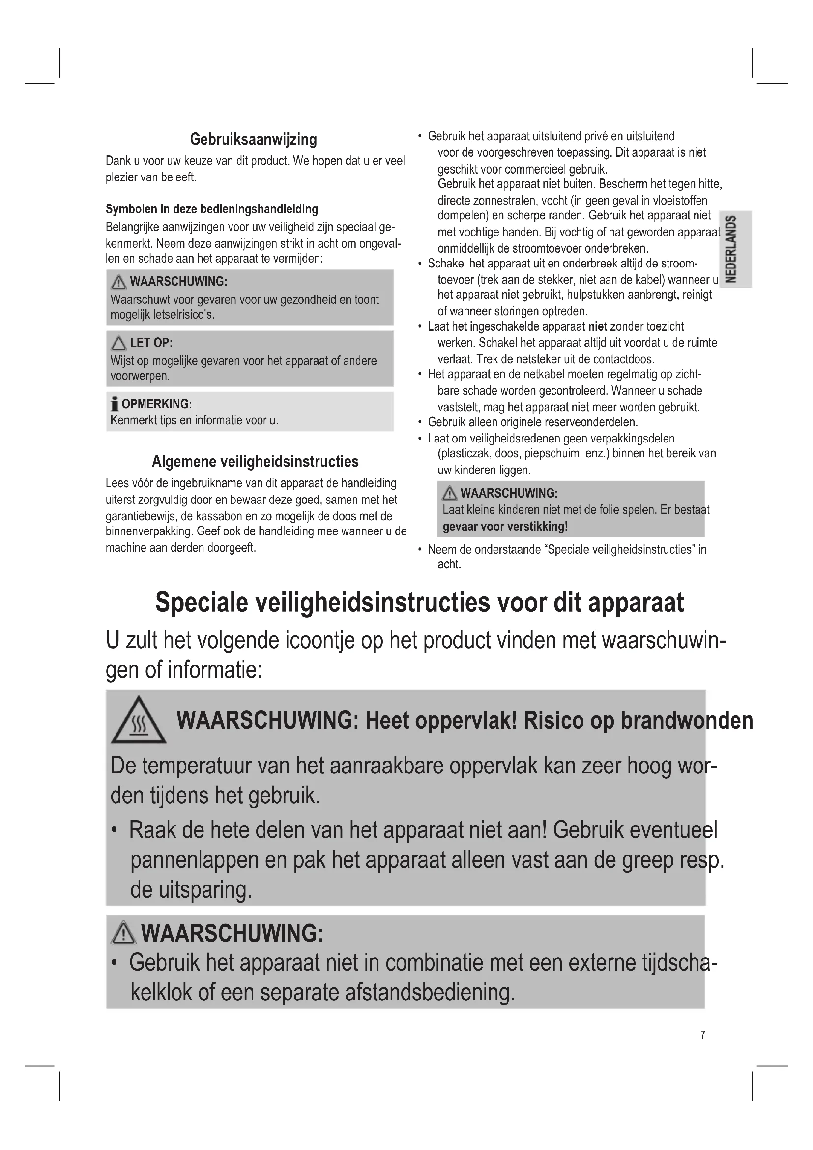 - Neem de onderstaande “Speciale veiligheidsinstructies” in acht. Speciale veiligheidsinstructies voor dit apparaat U zult het volgende icoontje op het product vinden met waarschuwin- gen of informatie: WAARSCHUWING: Heet oppervlak! Risico op brandwonden! De temperatuur van het aanraakbare oppervlak kan zeer hoog wor- den tijdens het gebruik.