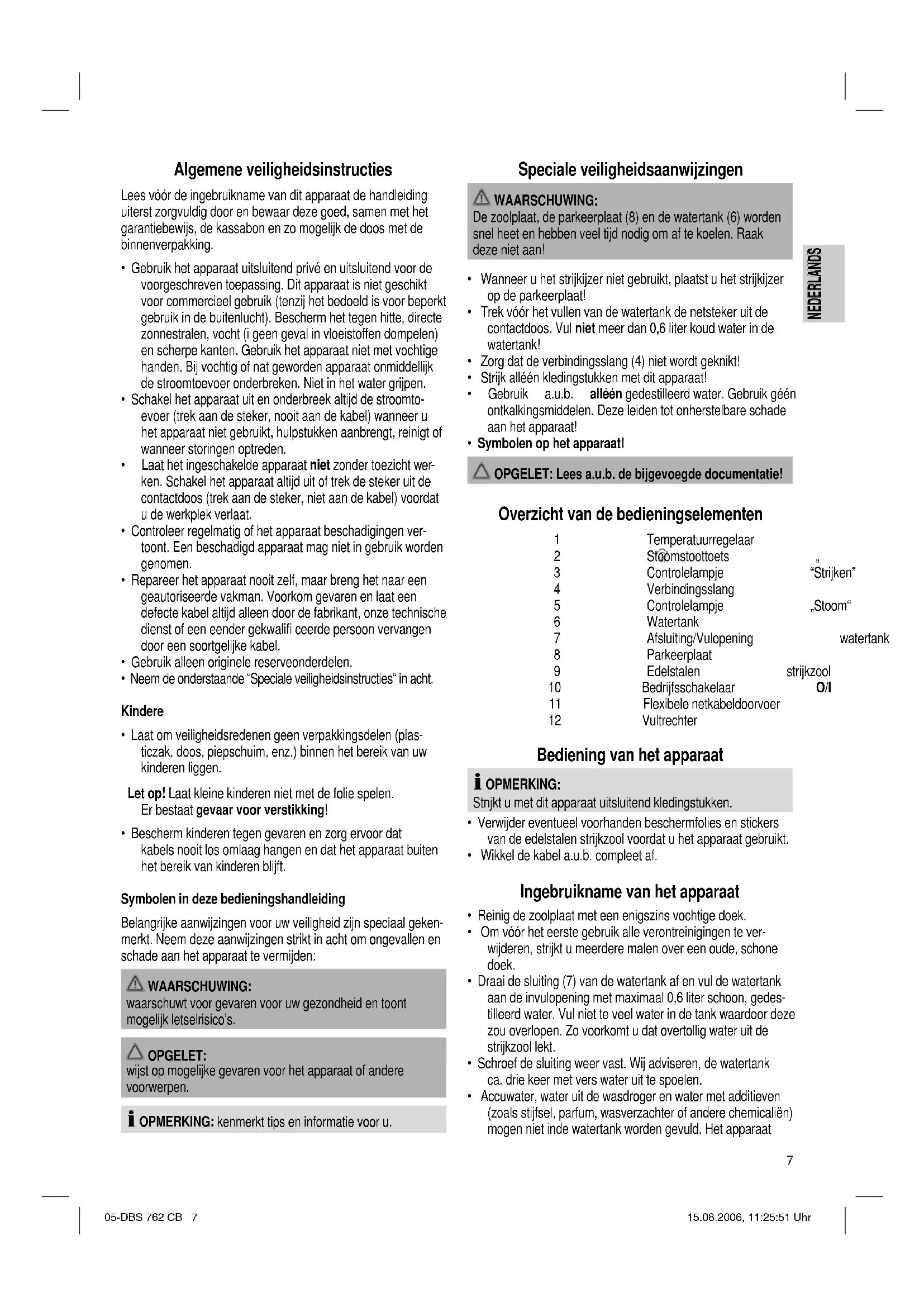 - Accuwater, water uit de wasdroger en water met additieven (zoals stijfsel, parfum, wasverzachter of andere chemicaliën) mogen niet inde watertank worden gevuld. Het apparaat 05-DBS 762 CB 7 15.08.2006, 11:25:51 Uhr8 NEDERLANDS NEDERLANDS zou daardoor kunnen worden beschadigd omdat zich in de stoomkamer resten kunnen vormen. Deze resten kunnen het te strijken wasgoed verontreinigen wanneer deze resten uit de stoomuitlaatopening vallen. Aansluitwaarde In totaal kan het station een vermogen van 2000 W opnemen. Bij een dergelijke aansluitwaarde is het raadzaam, te voorzien in een gescheiden toevoer met een zekering via een 16 A veiligheidsschakelaar voor huishoudelijk gebruik. OPGELET: Waarschuwing voor overbelasting! Gebruik géén verlengs- noeren of meervoudige contactdozen omdat dit apparaat te veel vermogen heeft. Bediening van het apparaat Strijken zonder stoom