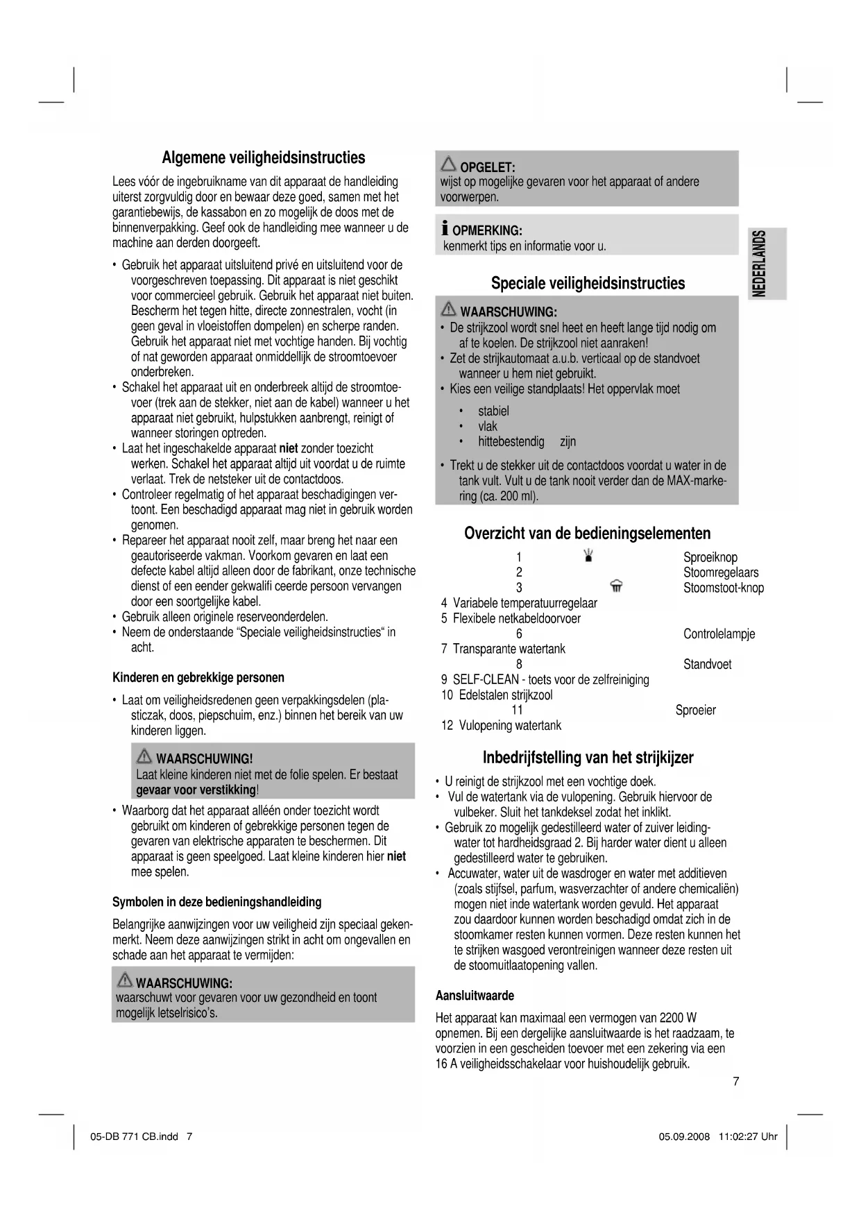 - Accuwater, water uit de wasdroger en water met additieven (zoals stijfsel, parfum, wasverzachter of andere chemicaliën) mogen niet inde watertank worden gevuld. Het apparaat zou daardoor kunnen worden beschadigd omdat zich in de stoomkamer resten kunnen vormen. Deze resten kunnen het te strijken wasgoed verontreinigen wanneer deze resten uit de stoomuitlaatopening vallen. Aansluitwaarde Het apparaat kan maximaal een vermogen van 2200 W opnemen. Bij een dergelijke aansluitwaarde is het raadzaam, te voorzien in een gescheiden toevoer met een zekering via een 16 A veiligheidsschakelaar voor huishoudelijk gebruik. 05-DB 771 CB.indd 705-DB 771 CB.indd 7 05.09.2008 11:02:27 Uhr05.09.2008 11:02:27 Uhr8 NEDERLANDS NEDERLANDS OPGELET: OVERBELASTING Gebruik géén verlengsnoeren of meervoudige contactdozen omdat dit apparaat te veel vermogen heeft. Bediening van het apparaat OPMERKING: Strijk met dit apparaat alléén kledingstukken en textiel!