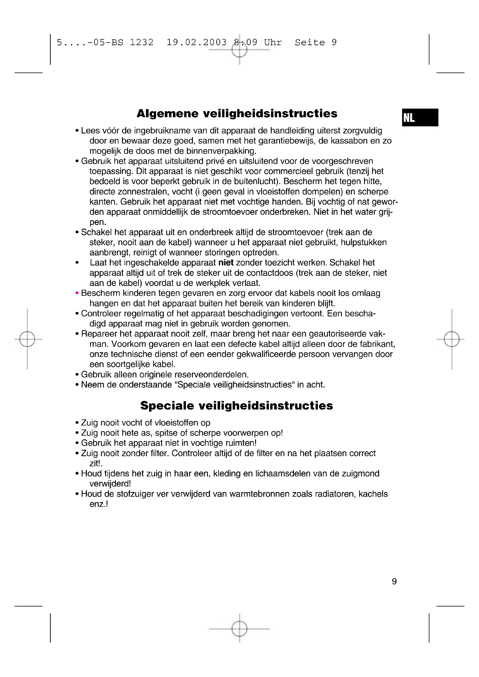 - Houd tijdens het zuig in haar een, kleding en lichaamsdelen van de zuigmond verwijderd!