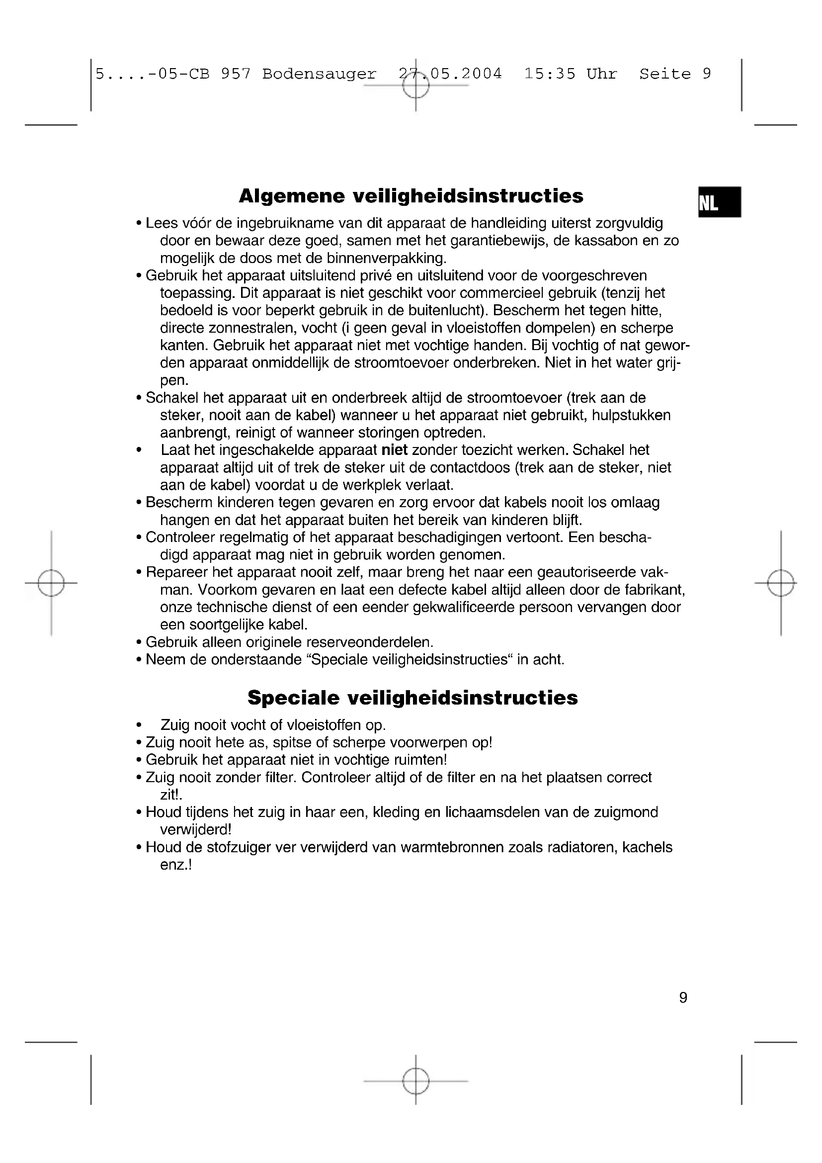 5....-05-CB 957 Bodensauger 27.05.2004 15:35 Uhr Seite 12Garantie Voor het door ons geleverde apparaat verlenen wij een garantie van 24 maanden vanaf koopdatum (kassabon). Eventuele gebreken aan het apparaat of aan het toebehoren*) die zijn ontstaan door productie- of materiaalfouten verhelpen wij binnen deze periode kosteloos door middel van reparatie of, naar ons oordeel, door vervanging. Eventuele garan- tiegevallen verlengen noch de geldigheidsduur van de garantie, noch begint daar- door een nieuwe garantieperiode! Het koopbewijs geldt als garantiebewijs. Zonder dit bewijs kan geen kosteloze reparatie of vervanging plaatsvinden. Geef in garantiegevallen het complete apparaat in de originele verpakking samen met de kassabon af bij uw handelaar. *) Schade aan onderdelen leidt niet automatisch tot kosteloze vervanging van het complete apparaat. Neem in dit geval contact op met onze hotline! De reparatie van glasbreuk of breuk van kunststofonderdelen wordt altijd berekend! Niet defecten aan de hulpstukken of aan de slijtende onderdelen (bijv. koolborstels, deeghaken, drijfriemen, reserveafstandsbediening, reservetandenborstels, zaag- bladen enz.), maar ook reiniging, onderhoud of de vervanging van slijtende delen vallen niet onder de garantie en geschieden altijd tegen berekening! Bij ingrepen door derden komt de garantieverlening te vervallen. Na de garantieperiode Na afloop van de garantieperiode kunnen reparaties tegen berekening worden uit- gevoerd door de betreffende vakhandelaar of de technische dienst.
