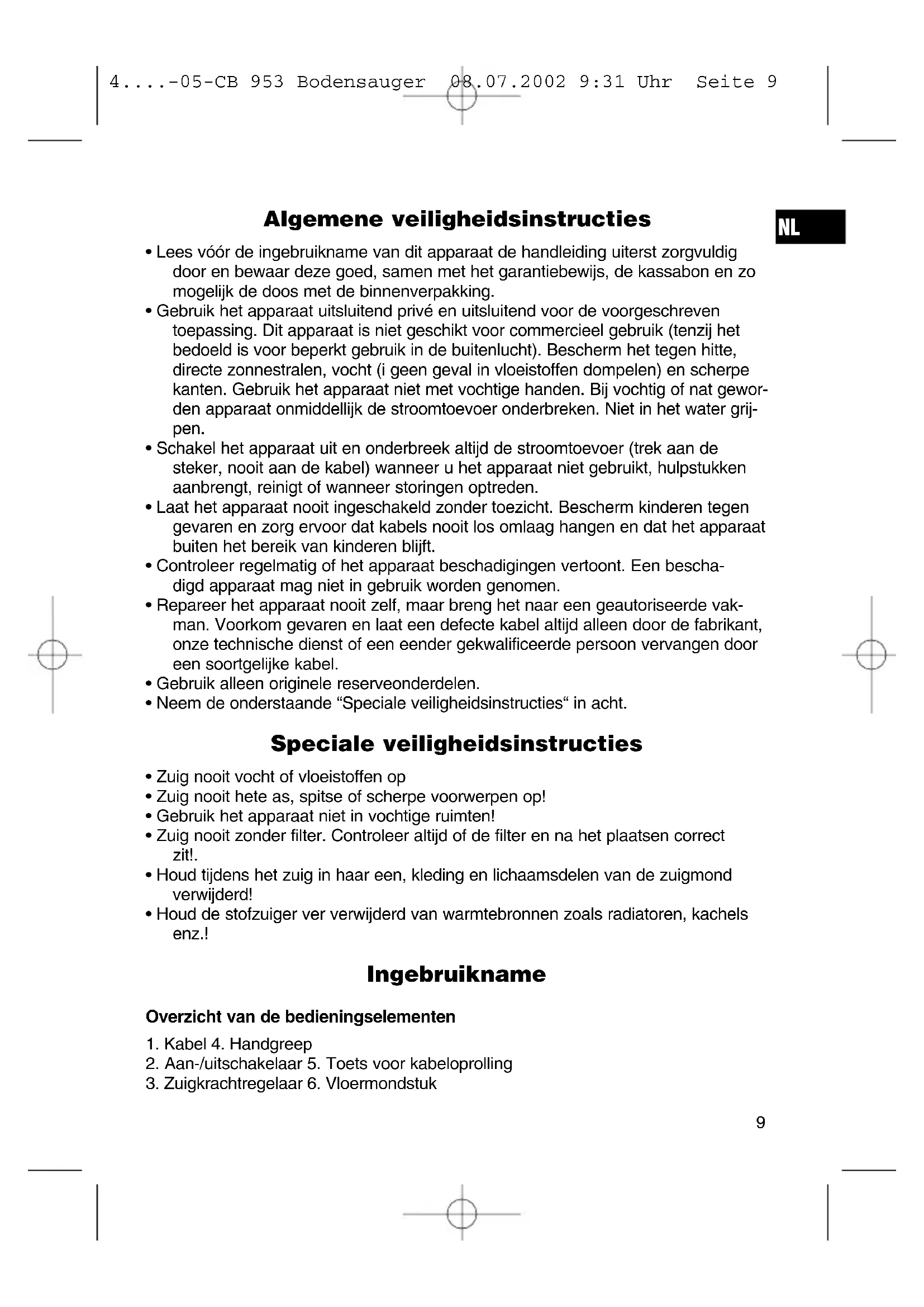 - Houd de stofzuiger ver verwijderd van warmtebronnen zoals radiatoren, kachels enz.! Ingebruikname Overzicht van de bedieningselementen