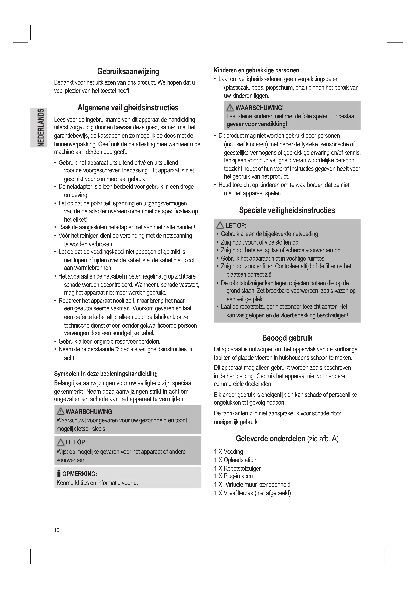 - Laat de robotstofzuiger niet zonder toezicht achter. Het kan vastgelopen en de vloerbedekking beschadigen! Beoogd gebruik Dit apparaat is ontworpen om het oppervlak van de kortharige tapijten of gladde vloeren in huishoudens schoon te maken. Dit apparaat mag alleen gebruikt worden zoals beschreven in de handleiding. Gebruik het apparaat niet voor andere commerciële doeleinden. Elk ander gebruik is oneigenlijk en kan schade of persoonlijke ongelukken tot gevolg hebben. De fabrikanten zijn niet aansprakelijk voor schade door oneigenlijk gebruik. Geleverde onderdelen (zie afb. A) 1 X Voeding 1 X Oplaadstation 1 X Robotstofzuiger 1 X Plug-in accu 1 X “Virtuele muur”-zendeenheid 1 X Vlieslterzak (niet afgebeeld)11 Het apparaat uitpakken