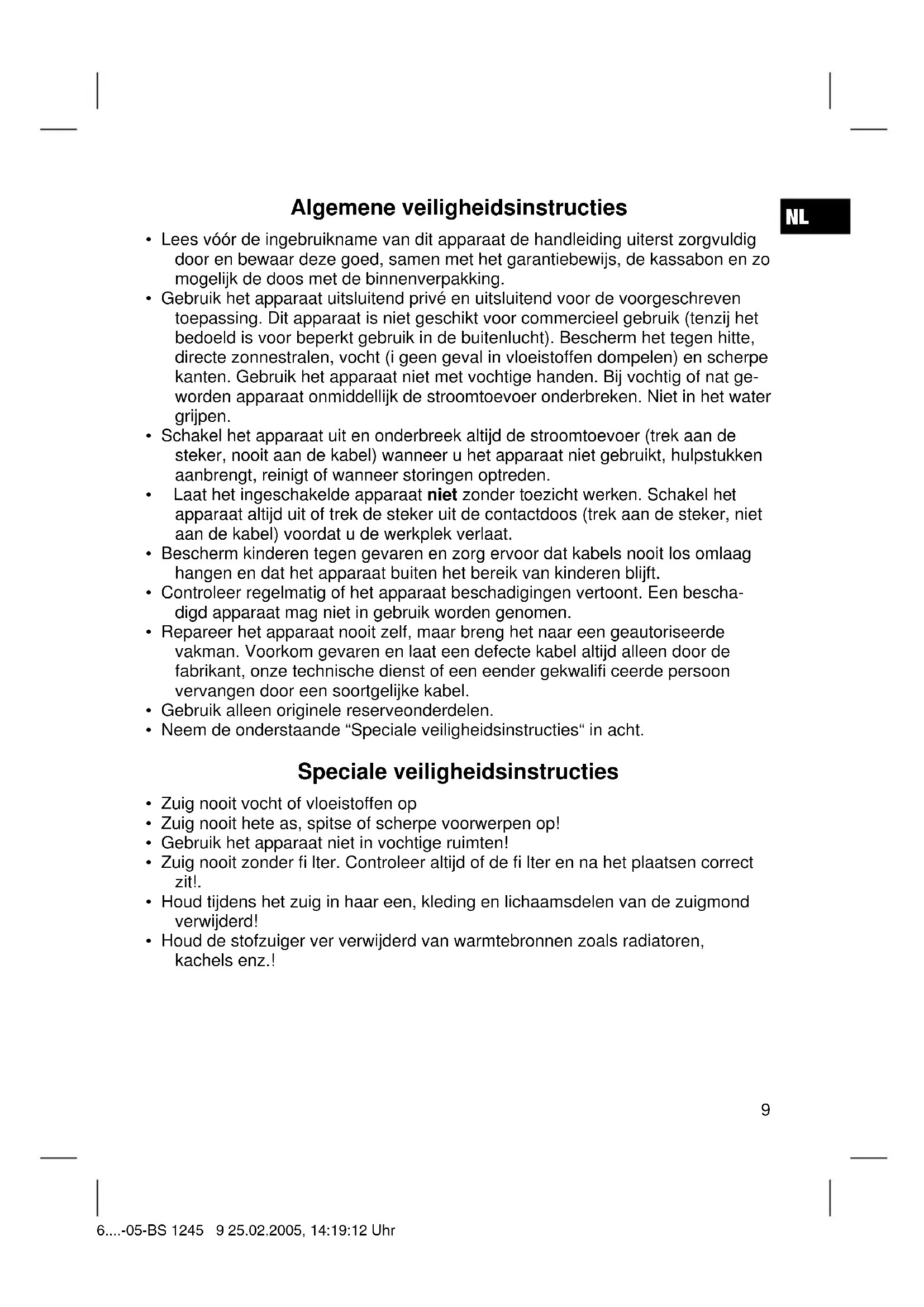 - Wanneer u het apparaat verticaal opbergt, hangt u de haak van de zuigbuis in de parkeerhulp aan de onderzijde van het apparaat. Dit apparaat is gekeurd conform de op dit moment van toepassing zijnde CE- richtlijnen zoals bijvoorbeeld elektromagnetische compatibiliteit en laagspan- ningsvoorschriften en is geconstrueerd volgens de nieuwste veiligheidstechnische voorschriften. Technische wijzigingen voorbehouden! Garantie Voor het door ons geleverde apparaat verlenen wij een garantie van 24 maanden vanaf koopdatum (kassabon). Eventuele gebreken aan het apparaat of aan het toebehoren*) die zijn ontstaan door productie- of materiaalfouten verhelpen wij binnen deze periode kosteloos door middel van reparatie of, naar ons oordeel, door vervanging. Eventuele garantiegevallen verlengen noch de geldigheidsduur van de garantie, noch begint daardoor een nieuwe garantieperiode! Het koopbewijs geldt als garantiebewijs. Zonder dit bewijs kan geen kosteloze reparatie of vervanging plaatsvinden. Geef in garantiegevallen het complete apparaat in de originele verpakking samen met de kassabon af bij uw handelaar. 6....-05-BS 1245 12 25.02.2005, 14:19:13 UhrNL