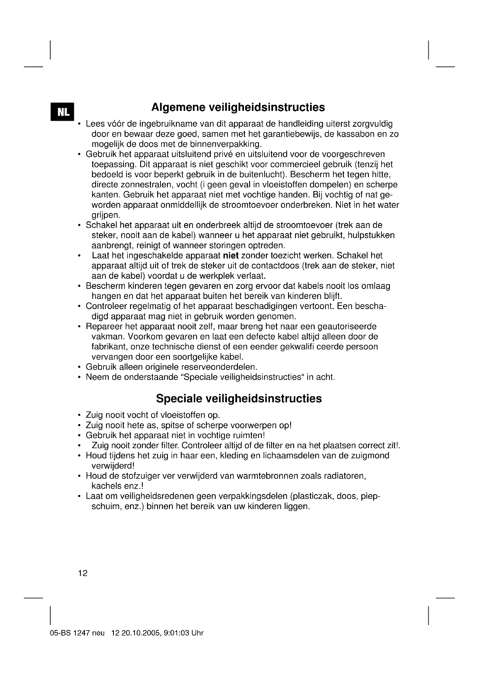 - Laat om veiligheidsredenen geen verpakkingsdelen (plasticzak, doos, piep- schuim, enz.) binnen het bereik van uw kinderen liggen. 05-BS 1247 neu 12 20.10.2005, 9:01:03 UhrNL