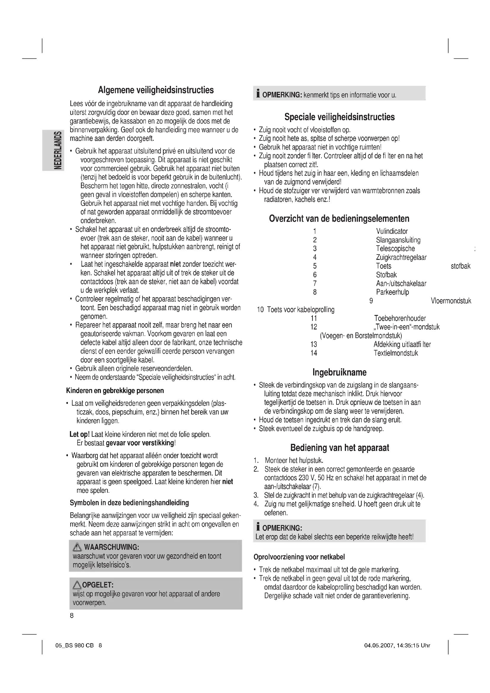 - Wanneer het zuigvermogen tijdens het bedrijf plotseling minder wordt, kan dit het gevolg zijn van een verstopte fi lter. 05_BS 980 CB 10 04.05.2007, 14:35:18 UhrNEDERLANDS