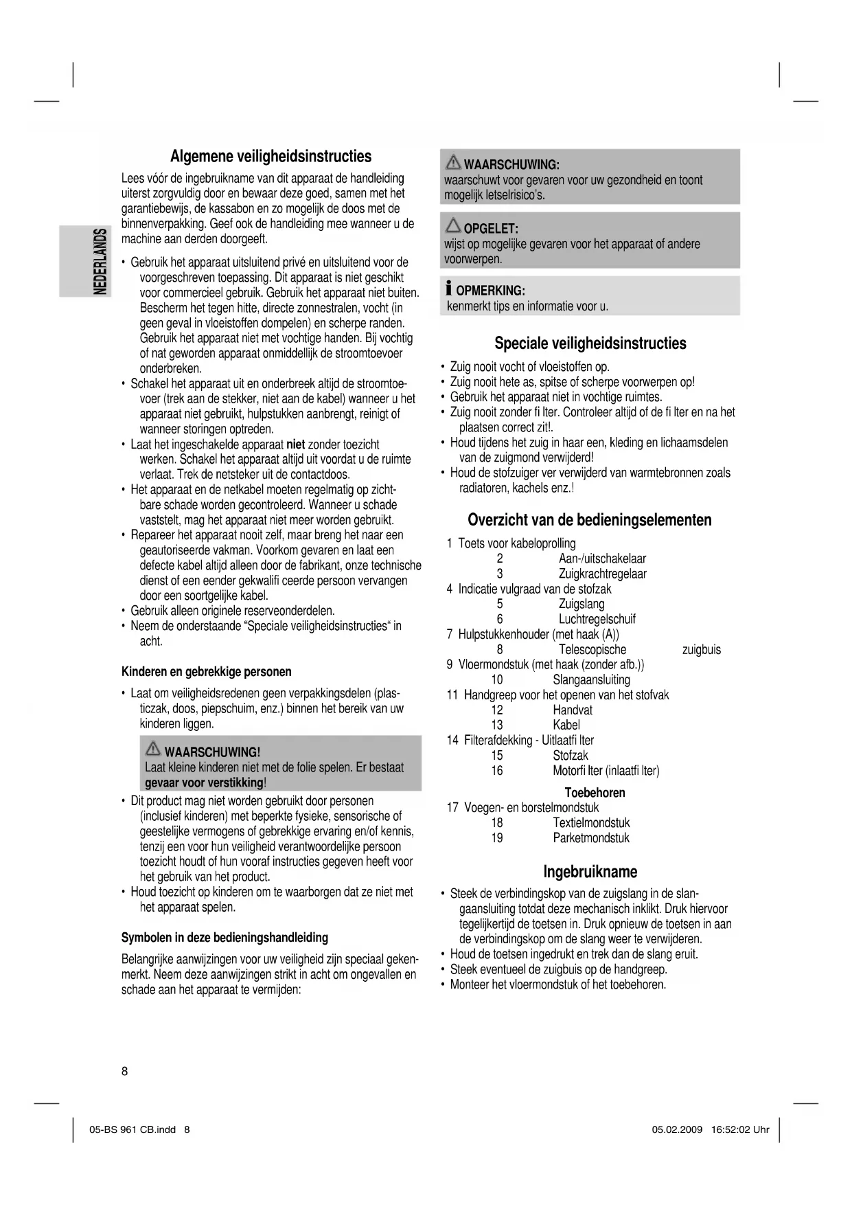 max. : ............................................................................ 2300 W Stofzak: .......................................................................Swirl Y 201 Beschermingsklasse: .................................................................. ΙΙ Nettogewicht: .....................................................................5,90 kg Dit apparaat is gekeurd conform de op dit moment van toepas- sing zijnde CE-richtlijnen zoals bijvoorbeeld elektromagnetische compatibiliteit en laagspanningsvoorschriften en is gecon- strueerd volgens de nieuwste veiligheidstechnische voorschrif- ten. Technische wijzigingen voorbehouden! Betekenis van het symbool ‘vuilnisemmer’ Bescherm ons milieu, elektrische apparaten horen niet in het huisafval. Maak voor het afvoeren van elektrische apparaten gebruik van de voorgeschreven verzamelpunten en geef daar de elektrische apparaten af die u niet meer gebruikt. Daardoor helpt u de potentiële effecten te voorkomen die een verkeerde afvoer op het milieu en de menselijke gezondheid kunnen hebben. Op deze wijze levert u uw bijdrage aan het hergebruik, de recycling en andere verwerkingsvormen voor oude elektronische en elektrische apparaten. Voor informatie over verzamelpunten voor uw apparaten kunt u contact opnemen met uw gemeente of gemeenteadministratie. 05-BS 961 CB.indd 1005-BS 961 CB.indd 10 05.02.2009 16:52:02 Uhr05.02.2009 16:52:02 Uhr