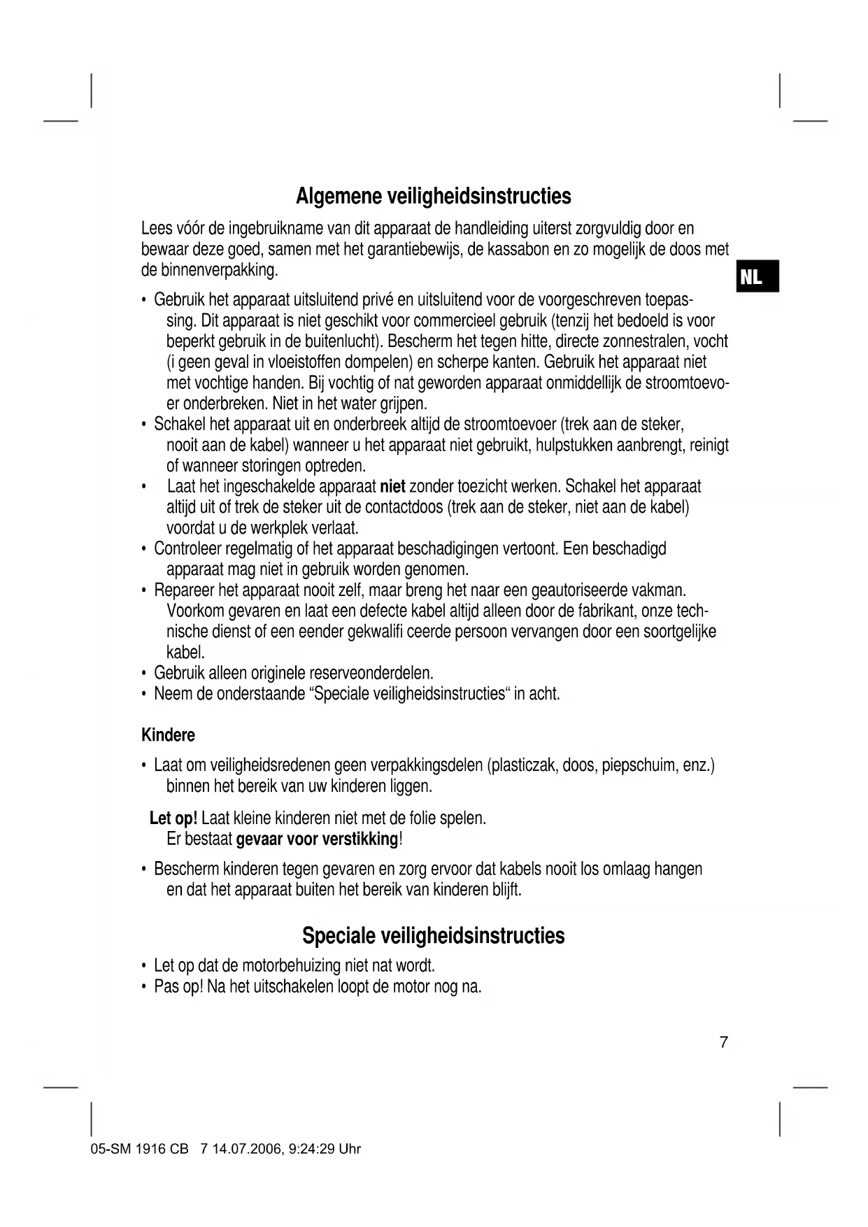 - Neem de onderstaande “Speciale veiligheidsinstructies“ in acht. Kindere