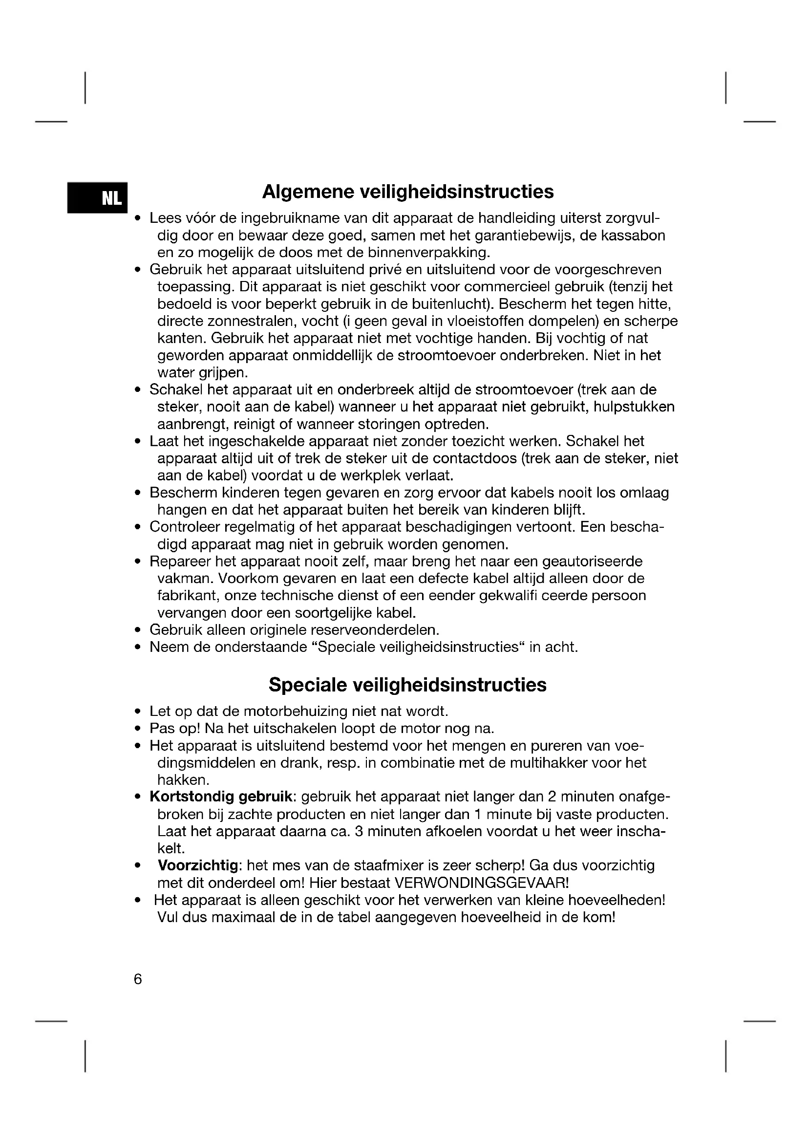 - Kortstondig gebruik: gebruik het apparaat niet langer dan 2 minuten onafge- broken bij zachte producten en niet langer dan 1 minute bij vaste producten. Laat het apparaat daarna ca. 3 minuten afkoelen voordat u het weer inscha- kelt.