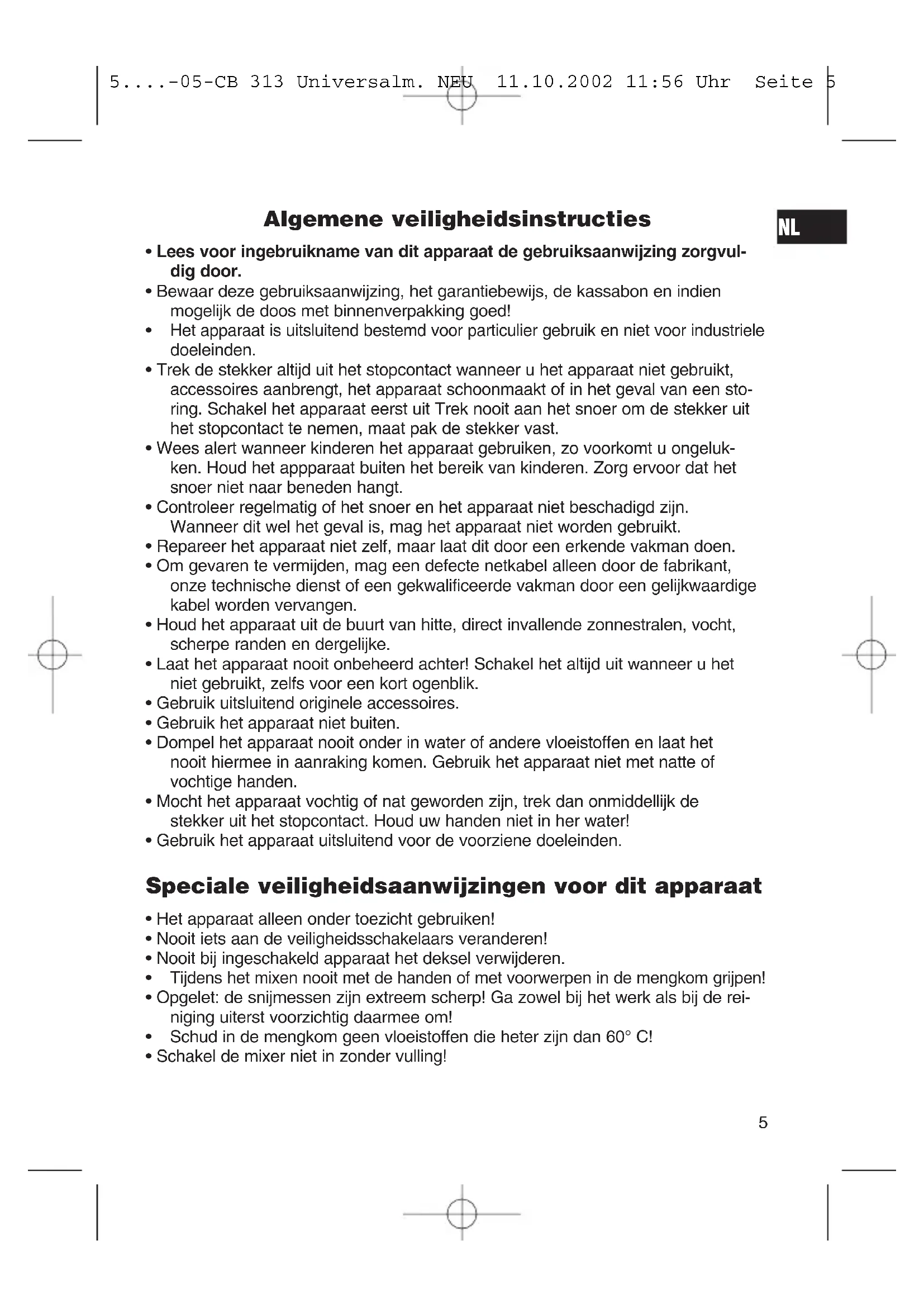 5....-05-CB 313 Universalm. NEU 11.10.2002 11:56 Uhr Seite 6Garantie Wij verlenen op het door ons verkochte apparaat een garantie van 24 maanden vanaf koopdatum (kassabon). Gedurende de garantieperiode verhelpen wij defecten aan het apparaat kosteloos door middel van reparatie of vervanging, voor zover deze defecten voortvloeien uit materiaal- of fabricagefouten. Uw koopbewijs is tevens het garantiebewijs. Zonder dit bewijs kan geen kosteloze reparatie of vervanging plaatsvinden. In geval van garantieverlening dient u het complete apparaat in de originele verpak- king samen met de kassabon bij uw handelaar af te geven. Glasbreuk of defecten aan accessoires leiden niet tot vervanging van het apparaat, maar worden kosteloos als vervanging toegezonden. In dit geval niet het apparaat opsturen, maar alleen het defecte accessoire bestellen! Reiniging, onderhoud en/of vervanging van slijtende delen vallen niet onder de garantiebepalingen en worden dus in rekening gesteld. De garantie vervalt bij eigenhandige reparaties of ingrepen. Na de garantieperiode Na afloop van de garantieperiode kunnen reparaties tegen berekening worden uit- gevoerd door de desbetreffende vakhandel of reparatieservice.