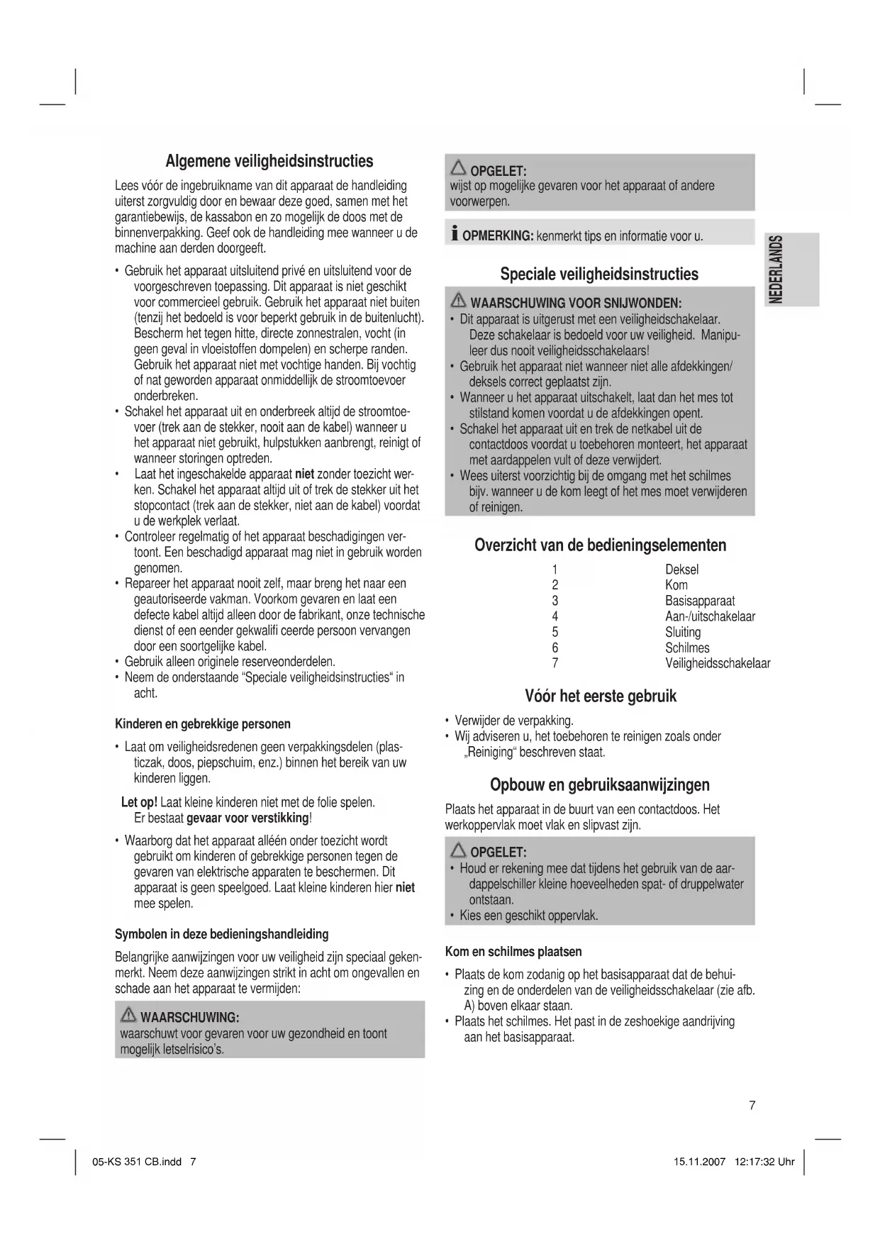 - Wees vooral bij de omgang met het schilmes uitermate voorzichtig! Verhelpen van storingen Storing Mogelijk oorzaak Maatregel Het apparaat functioneert niet Is het apparaat ingeschakeld? Controleer de positie van de aan- /uitschakelaar Is de contactdoos defect? Sluit het apparaat aan op een andere contactdoos De veiligheidsscha- kelaar wordt niet gebruikt Controleer of de kom en het deksel correct geplaatst zijn Lawaai bij het gebruik Door verschillend grote aardappe- len ontstaat een onbalans Sorteer de aardap- pelen of ondersteun het apparaat met uw hand Technische gegevens Spanningstoevoer: ....................................................230 V, 50 Hz Opgenomen vermogen: ........................................................70 W Beschermingsklasse: ................................................................... Ι Nettogewicht: ......................................................................1,62 kg Dit apparaat is gekeurd conform de op dit moment van toepas- sing zijnde CE-richtlijnen zoals bijvoorbeeld elektromagnetische compatibiliteit en laagspanningsvoorschriften en is gecon- strueerd volgens de nieuwste veiligheidstechnische voor- schriften. Technische wijzigingen voorbehouden! 05-KS 351 CB.indd 8 30.10.2007 12:17:32 U15.11.2007 12:17:32 Uhr Model: ...........................................................................KS 351 CB9 NEDERLANDS NEDERLANDS Garantie Voor het door ons geleverde apparaat verlenen wij een garantie van 24 maanden vanaf koopdatum (kassabon). Eventuele gebreken aan het apparaat of aan het toebehoren die zijn ontstaan door productie- of materiaalfouten verhelpen wij binnen deze periode kosteloos door middel van reparatie of, naar ons oordeel, door vervanging. Eventuele garantiegevallen verlengen noch de geldigheidsduur van de garantie, noch begint daardoor een nieuwe garantieperiode! Het koopbewijs geldt als garantiebewijs. Zonder dit bewijs kan geen kosteloze reparatie of vervanging plaatsvinden. Geef in garantiegevallen het complete apparaat in de originele verpakking samen met de kassabon af bij uw handelaar. Niet alleen defecten aan de hulpstukken of aan de slijtende onderdelen, maar ook reiniging, onderhoud of de vervanging van slijtende delen vallen niet onder de garantie en geschieden altijd tegen berekening! Bij ingrepen door derden komt de garantieverlening te vervallen. Na de garantieperiode Na afl oop van de garantieperiode kunnen reparaties tegen ber- ekening worden uitgevoerd door de betreffende vakhandelaar of de technische dienst. Betekenis van het symbool ‘vuilnisemmer’ Bescherm ons milieu, elektrische apparaten horen niet in het huisafval. Maak voor het afvoeren van elektrische apparaten gebruik van de voorgeschreven verzamelpunten en geef daar de elektrische apparaten af die u niet meer gebruikt. Daardoor helpt u de potentiële effecten te voorkomen die een verkeerde afvoer op het milieu en de menselijke gezondheid kunnen hebben. Op deze wijze levert u uw bijdrage aan het hergebruik, de recycling en andere verwerkingsvormen voor oude elektronische en elektrische apparaten. Voor informatie over verzamelpunten voor uw apparaten kunt u contact opnemen met uw gemeente of gemeenteadministratie. 05-KS 351 CB.indd 9 30.10.2007 15.11.2007 12:17:32 Uhr10 FRANÇAIS FRANÇAIS Conseils généraux de sécurité Lisez attentivement ce mode d’emploi avant de mettre l’appareil en marche pour la première fois. Conservez le mode d’emploi ainsi que le bon de garantie, votre ticket de caisse et si possible, le carton avec l’emballage se trouvant à l’intérieur. Si vous remettez l‘appareil à des tiers, veuillez-le remettre avec son mode d‘emploi.