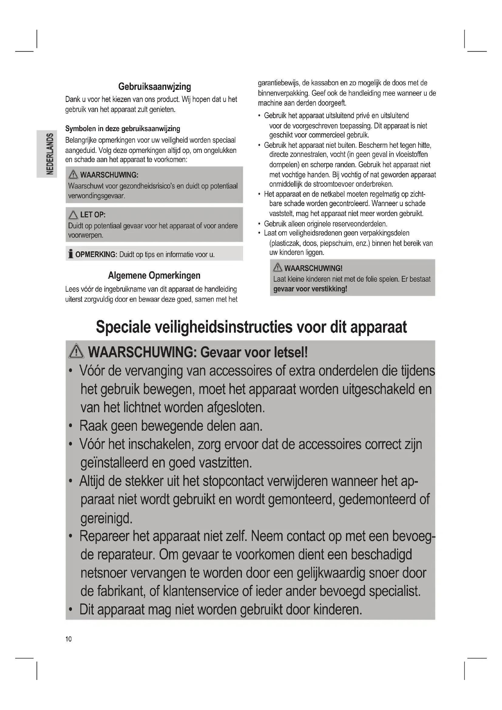 - Laat om veiligheidsredenen geen verpakkingsdelen (plasticzak, doos, piepschuim, enz.) binnen het bereik van uw kinderen liggen. WAARSCHUWING! Laat kleine kinderen niet met de folie spelen. Er bestaat gevaar voor verstikking! Speciale veiligheidsinstructies voor dit apparaat WAARSCHUWING: Gevaar voor letsel!