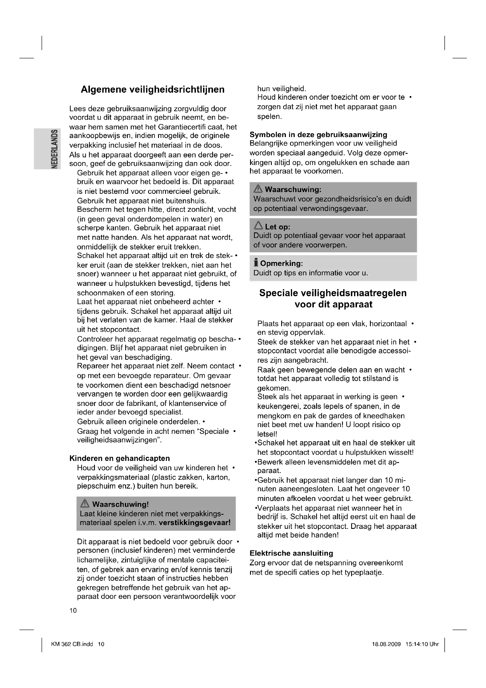beschreven onder “Reinigen”. Aanbevolen recepten Gerezen Deeg (Basisrecept) Snelheid stand 2 - 3 Ingrediënten: 250 gr zachte boter of margarine, 250 gr suiker, 1 zakje vanillesuiker of 1 zakje Ci- troenbakpoeder, 1 slufje zout, 4 eieren, 500 gr tarwebloem, 1 zakje bakpoeder, ongeveer 1/8 liter melk. Bereiding: Doe de tarwebloem met de andere ingredi- enten in de mengkom. Meng met de meng- haak gedurende 30 seconden op stand 2, en vervolgens ongeveer 3 minuten op stand 3. Vet een bakblik in of doe er bakpapier in. Doe het beslag in het bakblik en bak het. Test de cake voordat u hem uit de oven neemt door er in het midden een satéprikker in te steken. Als het beslag niet meer aan de prikker plakt is de cake gaar. Kiep de cake op een rooster en laat hem afkoelen. Conventionele oven: Sleuf: 2 Temperatuur: Elektrische oven: boven- en onderwarmte 175-200°, gas- oven: stand 2-3 Baktijd: 50-60 minuten U kunt dit recept aanpassen aan uw smaak, bijv. door het toevoegen van 100 gr. Rozijnen of 100 gr noten of 100 gr chocoladehagelslag. Uw verbeelding kent geen grenzen. Lijnzaadrolletjes Snelheid stand 1 - 2 Ingrediënten: 500-550 gr tarwebloem, 50 gr lijnzaad, 3/8-liter water, 1 blokje gist (40 gr), 100 gr magere kwark, goed uitgelekt, 1 theelepel zout. Voor afstrijken: 2 eetlepels water Bereiding: Week het lijnzaad in 1/8-liter lauw water. Doe het resterende lauwe water (1/4 liter) in de mengkom. Kruimel hier de gist in, en voeg de kwark toe. Meng het goed met de kneedhaak op stand 1. De gist dient volledig opgelost te zijn. Doe de bloem met het geweekte lijnzaad en het zout in de mengkom. Kneed op stand 1, en schakel daarna naar stand 2 en meng gedurende 3-5 minuten. Dek het deeg af en KM 362 CB.indd 12KM 362 CB.indd 12 18.08.2009 15:14:11 Uhr18.08.2009 15:14:11 Uhr Maak het deeg los m.b.v. spatel en neem het uit de kom.