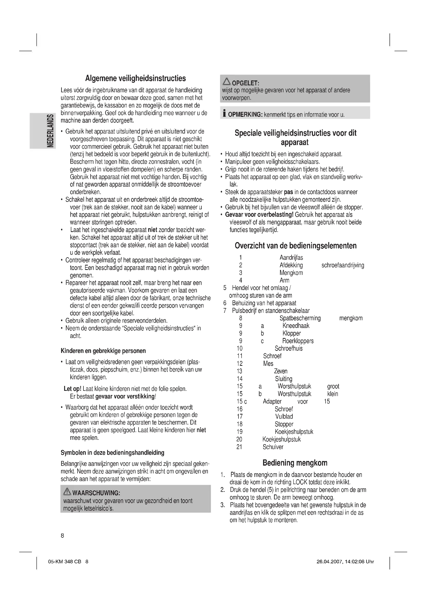 - Gebruik een vochtige doek om de buitenkant van de behui- zing te reinigen. Mengkom, roergereedschappen en onderdelen van de vleeswolf OPGELET: De onderdelen zijn niet geschikt voor reiniging in de vaatwas- machine. Onder invloed van hitte en scherpe reinigers kunnen deze vervormen of verkleuren. 05-KM 348 CB 10 26.04.2007, 14:02:13 Uhr11 NEDERLANDS NEDERLANDS