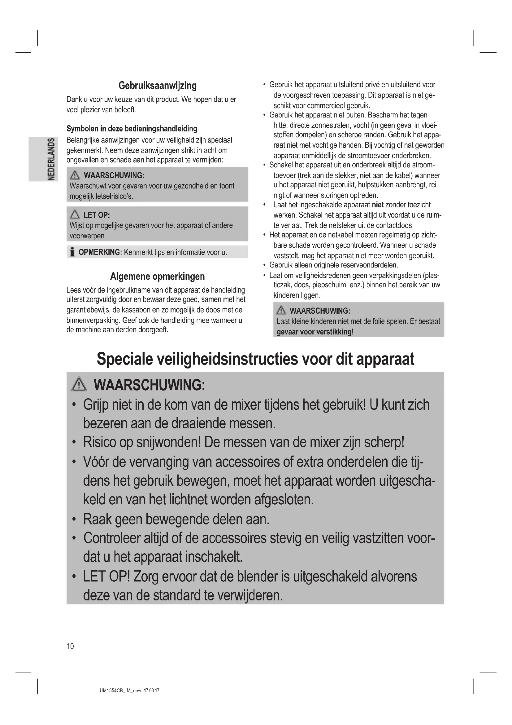 - Na het reinigen en afdrogen van alle onderdelen monteert u de mixer zoals beschreven onder “Montage”. Behuizing Gebruik alleen een matig vochtige doek om de buitenkant van het apparaat te reinigen. Verhelpen van storingen Probleem Mogelijke oorzaak Maatregel Het apparaat functioneert niet. Het apparaat ontvangt geen voeding. Controleer het stopcontact met een ander apparaat. Steek de stekker correct in het stopcontact. Controleer de hoofdcircuitbreker. Verkeerde schakelaarinstelling. Controleer de positie van de draaischakelaar. Uw apparaat is uitgerust met een veiligheidsschake- laar. Deze voorkomt het abusievelijk starten van de motor. Controleer of de mengkom en de veiligheidsschijf correct geplaatst zijn.14 UM1354CB_IM_new 17.03.17 Technische gegevens Model:...................................................................UM 1354 CB Spanningstoevoer: ............................... 220 - 240 V~, 50 / 60 Hz Opgenomen vermogen: ..................................................600 W Beschermingsklasse: .............................................................. Korte bedrijfstijd: ............................................................. 1 min. Volume: ..................................................................0,5 - 1,5 liter Nettogewicht: ...........................................................ong. 3,1 kg Het recht om technische en ontwerpaanpassingen te maken in de loop van voortdurende productontwikkeling blijft voorbehouden. Dit apparaat is gekeurd conform de op dit moment van toepassing zijnde CE-richtlijnen zoals bijvoorbeeld elektro- magnetische compatibiliteit en laagspanningsvoorschriften en is geconstrueerd volgens de nieuwste veiligheidstechnische voorschriften. Verwijdering Betekenis van het “vuilnisbak”-symbool Houd rekening met het milieu, gooi elektrische apparaten niet weg bij het huishoudafval. Breng overbodige of defecte elektrische appa- raten naar gemeentelijke inzamelpunten. Help potentiële milieu- en gezondheidsgevaren door onverantwoordelijk wegwerpen te voorkomen. Draag bij aan hergebruik en ander opnieuw gebruik van oude elektrische en elektronische apparaten. Uw gemeente kan u informatie geven over inzamelingspunten.15 UM1354CB_IM_new 17.03.17 Mode d’emploi Merci d’avoir choisi notre produit. Nous espérons que vous saurez proter votre appareil. Symboles de ce mode d’emploi Les informations importantes pour votre sécurité sont particu- lièrement indiquées. Veillez à bien respecter ces indications an d’éviter tout risque d’accident ou d’endommagement de l’appareil :