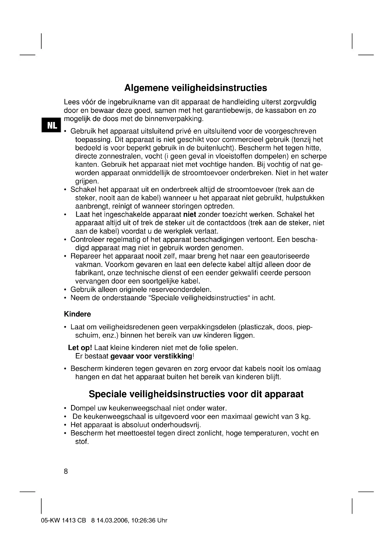 - Droog het apparaat na de reiniging zorgvuldig af met een droge, zachte doek. Technische gegevens Model: ...................................................................................................KW 1413 CB Spanningstoevoer:....................................................................... DC 3 V (CR 3032) Max. gewichtsbelasting: .....................................................................................3 kg Dit apparaat is gekeurd conform de op dit moment van toepassing zijnde CE- richtlijnen zoals bijvoorbeeld elektromagnetische compatibiliteit en laagspan- ningsvoorschriften en is geconstrueerd volgens de nieuwste veiligheidstechnische voorschriften. Technische wijzigingen voorbehouden! 05-KW 1413 CB 11 14.03.2006, 10:26:40 UhrNL
