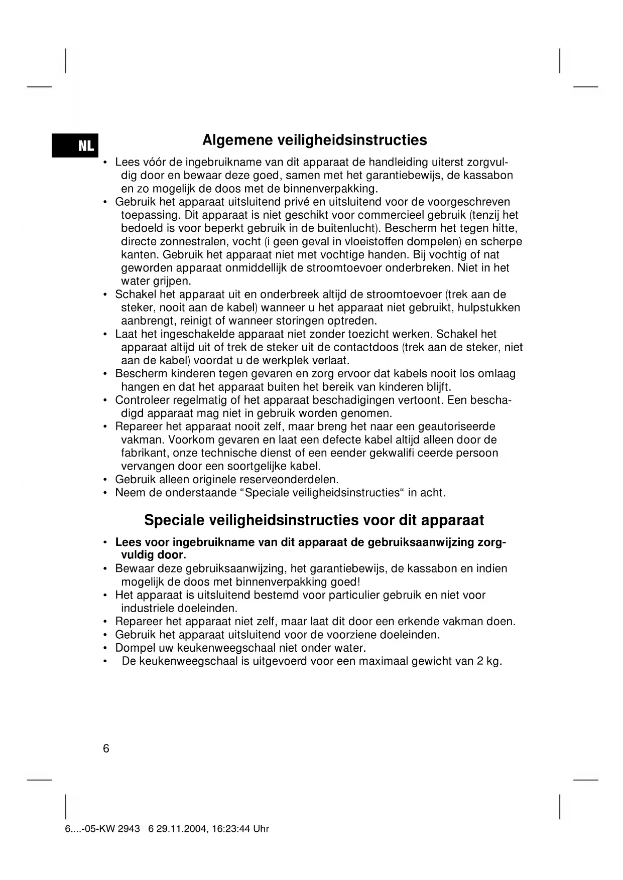 - Wanneer de weergave „EE“ weergeeft, ligt het gewicht boven de 2 kg. Dit apparaat is gekeurd conform de op dit moment van toepassing zijnde CE- richtlijnen zoals bijvoorbeeld elektromagnetische compatibiliteit en laagspan- ningsvoorschriften en is geconstrueerd volgens de nieuwste veiligheidstechni- sche voorschriften. Technische wijzigingen voorbehouden! Garantie Voor het door ons geleverde apparaat verlenen wij een garantie van 24 maanden vanaf koopdatum (kassabon). Eventuele gebreken aan het apparaat of aan het toebehoren*) die zijn ontstaan door productie- of materiaalfouten verhelpen wij binnen deze periode kosteloos door middel van reparatie of, naar ons oordeel, door vervanging. Eventuele garantiegevallen verlengen noch de geldigheidsduur van de garantie, noch begint daardoor een nieuwe garantieperiode! Het koopbewijs geldt als garantiebewijs. Zonder dit bewijs kan geen kosteloze reparatie of vervanging plaatsvinden. Geef in garantiegevallen het complete apparaat in de originele verpakking samen met de kassabon af bij uw handelaar. *) Schade aan onderdelen leidt niet automatisch tot kosteloze vervanging van het complete apparaat. Neem in dit geval contact op met onze hotline! De reparatie van glasbreuk of breuk van kunststofonderdelen wordt altijd berekend! 6....-05-KW 2943 8 29.11.2004, 16:23:44 UhrNL