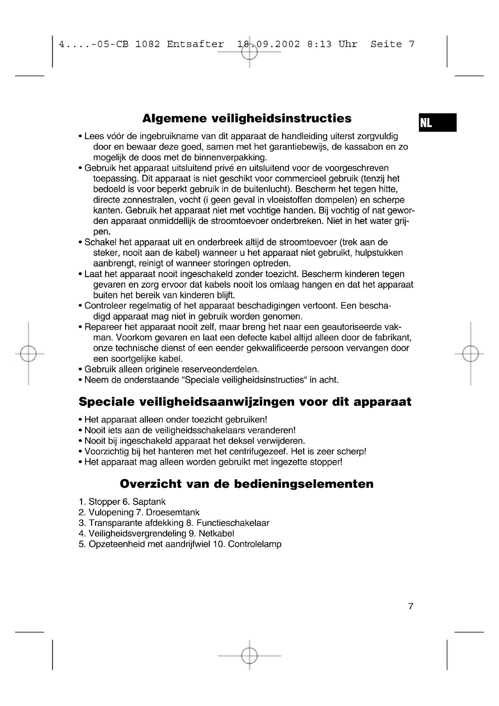 4....-05-CB 1082 Entsafter 18.09.2002 8:13 Uhr Seite 8Geef in garantiegevallen het complete apparaat in de originele verpakking samen met de kassabon af bij uw handelaar. *) Schade aan onderdelen leidt niet automatisch tot kosteloze vervanging van het complete apparaat. Neem in dit geval contact op met onze hotline! De reparatie van glasbreuk of breuk van kunststofonderdelen wordt altijd berekend! Niet defecten aan de hulpstukken of aan de slijtende onderdelen (bijv. koolborstels, deeghaken, drijfriemen, reserveafstandsbediening, reservetandenborstels, zaag- bladen enz.), maar ook reiniging, onderhoud of de vervanging van slijtende delen vallen niet onder de garantie en geschieden altijd tegen berekening! Bij ingrepen door derden komt de garantieverlening te vervallen. Na de garantieperiode Na afloop van de garantieperiode kunnen reparaties tegen berekening worden uit- gevoerd door de betreffende vakhandelaar of de technische dienst.