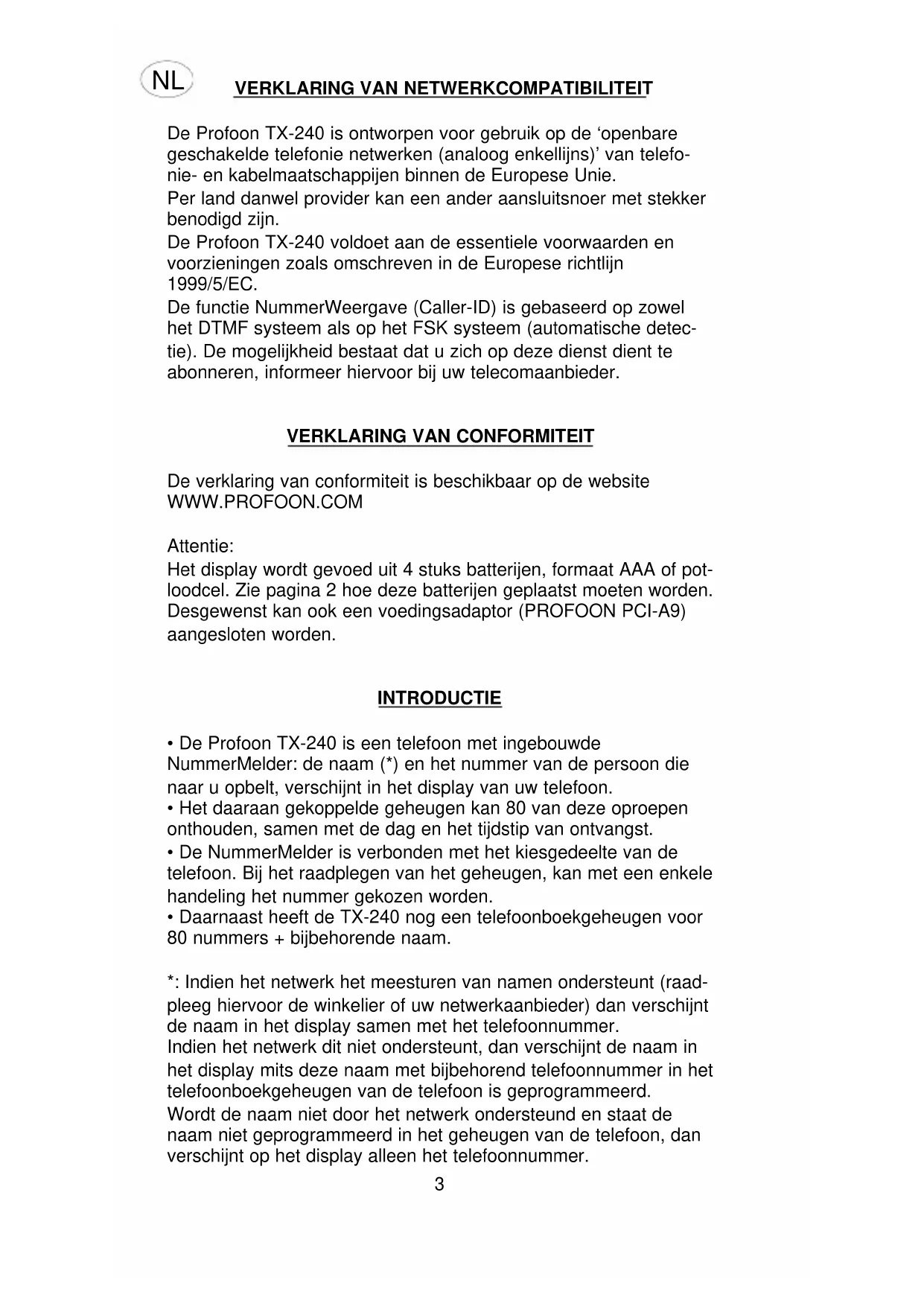 GEBRAUCHSANLEITUNG USERS MANUAL TX-2402 NL: Gebruiksaanwijzing: blz. 1 Garantiebewijs: blz. 42 FR: Mode d’emploi: page 11 Carte de garantie: page 43 GB: Users manual: page 21 Warrantycard: page 44 D: Gebrauchsanleitung: Seite 31 Garantieschein: Seite 45VERKLARING VAN NETWERKCOMPATIBILITEIT De Profoon TX-240 is ontworpen voor gebruik op de ‘openbare geschakelde telefonie netwerken (analoog enkellijns)’ van telefo- nie- en kabelmaatschappijen binnen de Europese Unie. Per land danwel provider kan een ander aansluitsnoer met stekker benodigd zijn. De Profoon TX-240 voldoet aan de essentiele voorwaarden en voorzieningen zoals omschreven in de Europese richtlijn 1999/5/EC. De functie NummerWeergave (Caller-ID) is gebaseerd op zowel het DTMF systeem als op het FSK systeem (automatische detec- tie). De mogelijkheid bestaat dat u zich op deze dienst dient te abonneren, informeer hiervoor bij uw telecomaanbieder.