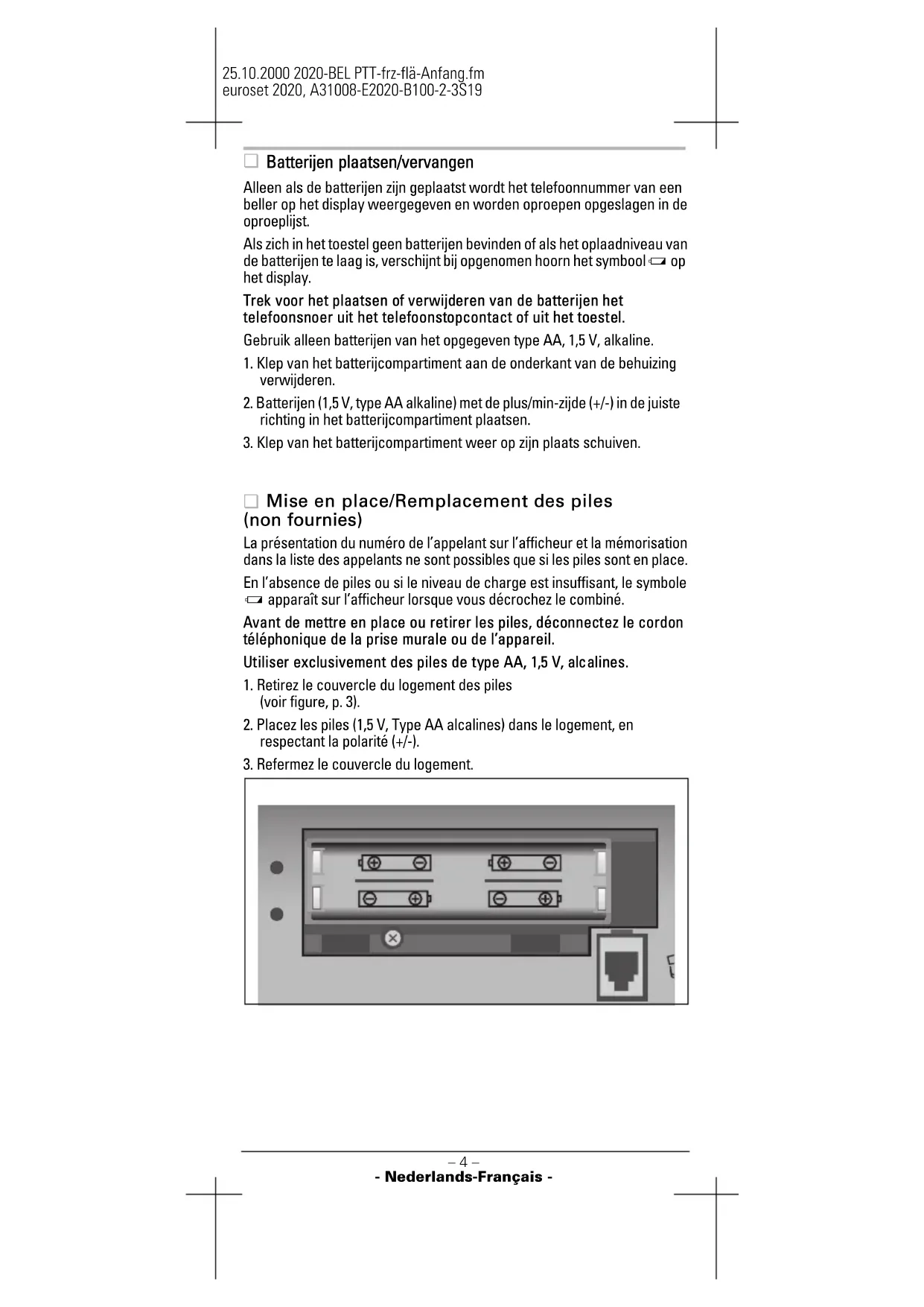 het display. Trek voor het plaatsen of verwijderen van de batterijen het telefoonsnoer uit het telefoonstopcontact of uit het toestel. Gebruik alleen batterijen van het opgegeven type AA, 1,5 V, alkaline.